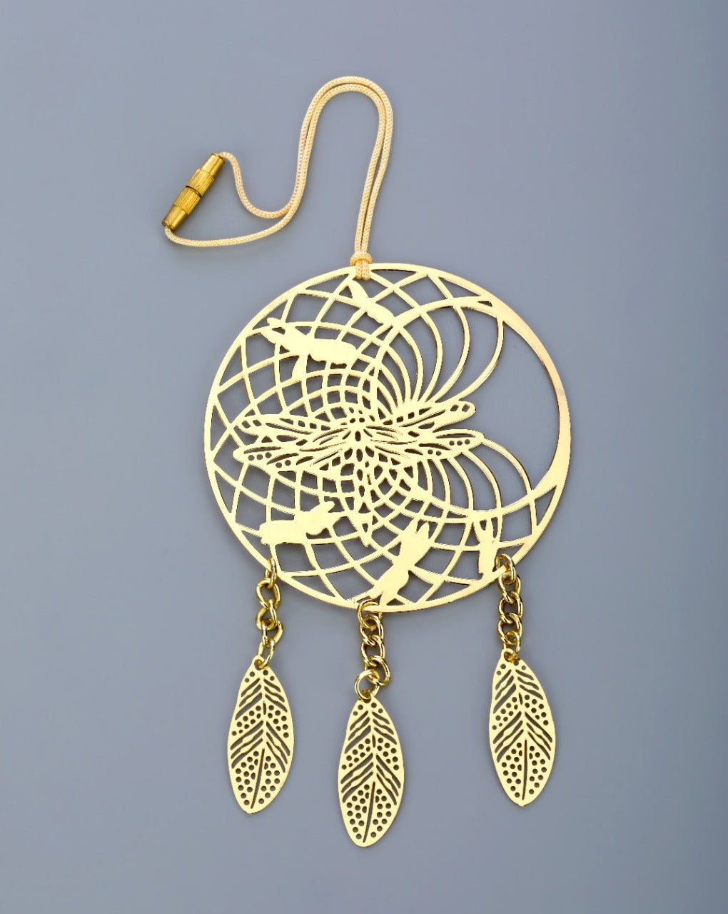 This decorative dream catcher is crafted with a beautiful golden finish and a hanging dori with barrel lock for easy installation, this metal dream catcher is sure to create a more peaceful sleep environment and establish harmony in your home.