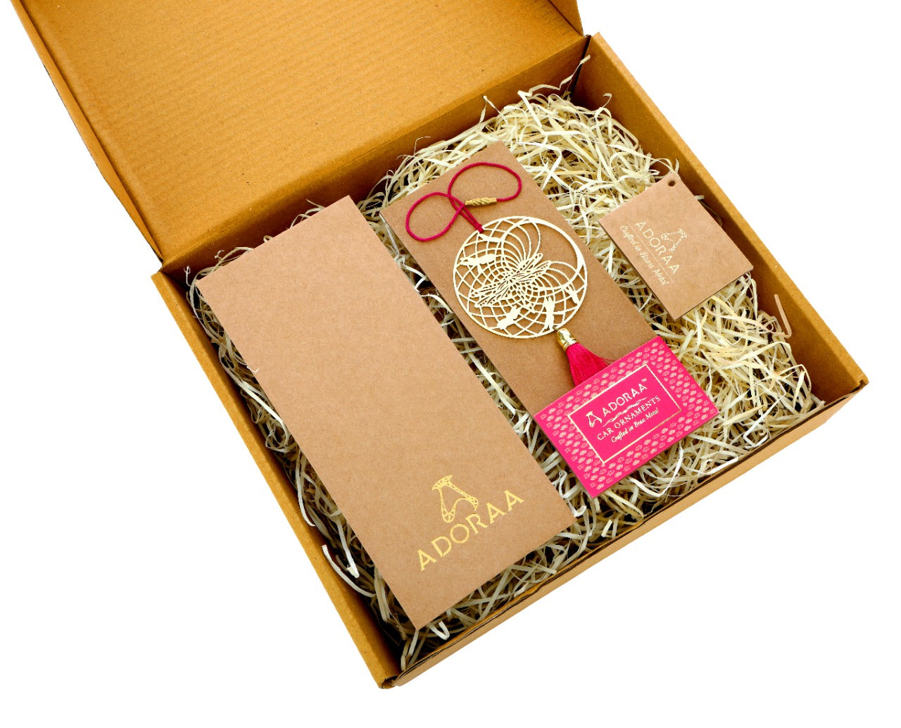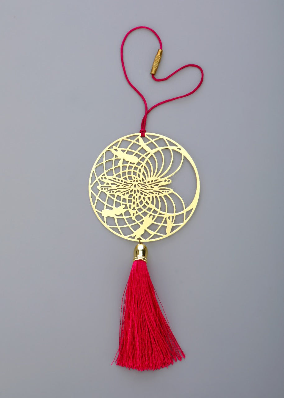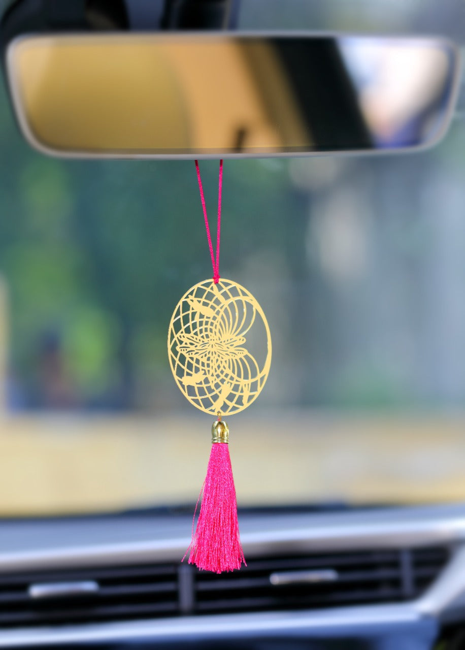 Golden Brass Metal Car Hanging rear view mirror Accessory/Décor with Red Dori & Tassel. Handcrafted, by women artisans. Exclusive collection of Elegant design Automotive Rear View Mirror charm for your special car. Great decoration for car and perfect Gift for your friend, family and lover