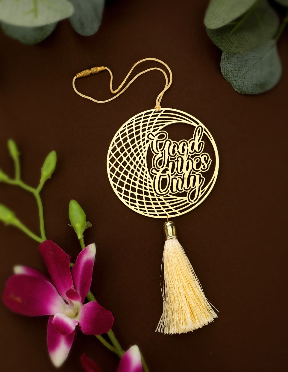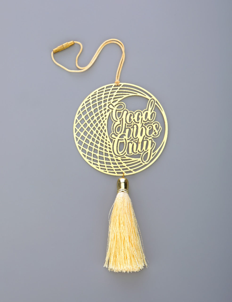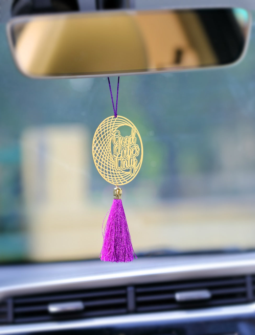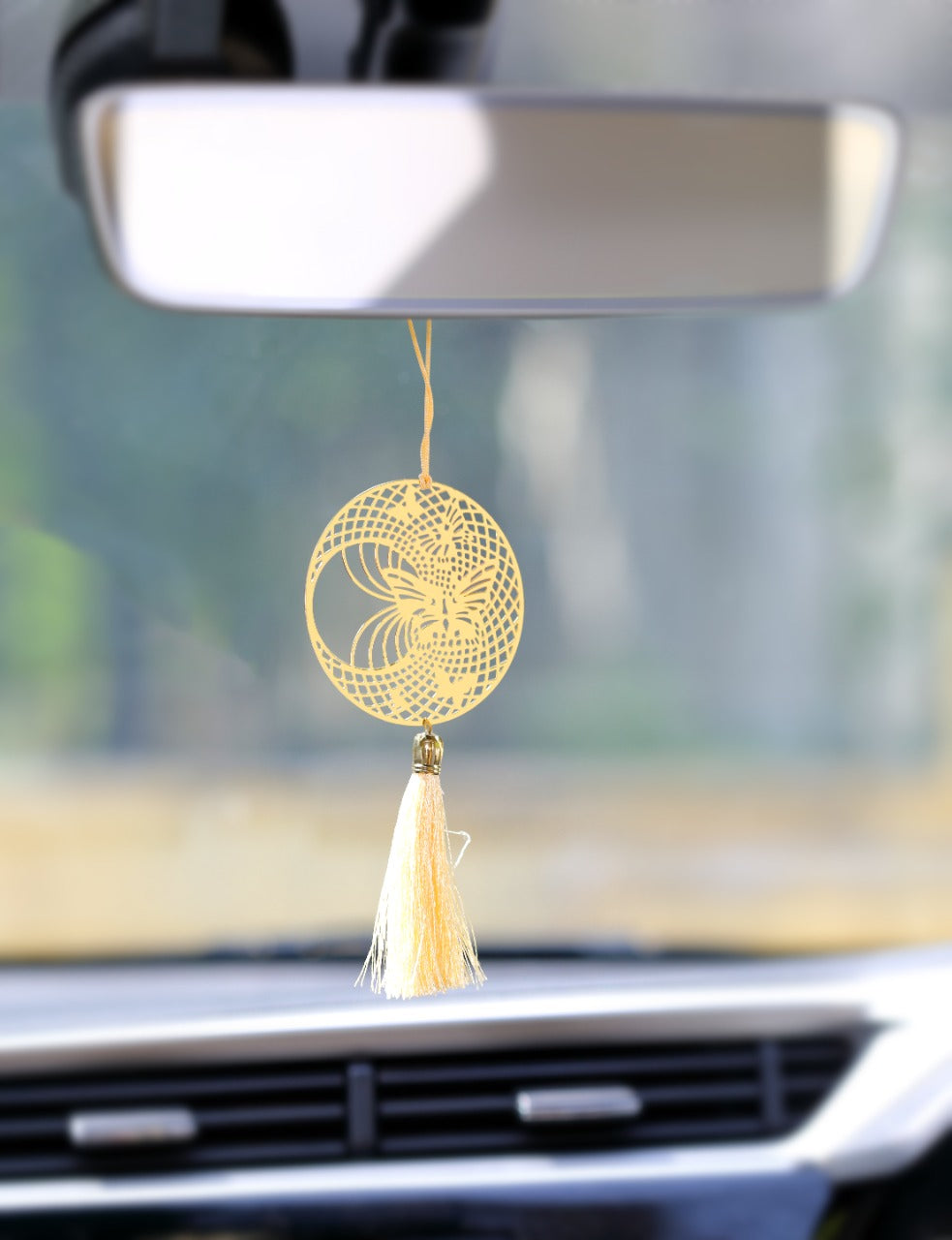 Golden Brass Metal Car Hanging rear view mirror Accessory/Décor with Red Dori & Tassel. Handcrafted, by women artisans. Exclusive collection of Elegant design Automotive Rear View Mirror charm for your special car. Great decoration for car and perfect Gift for your friend, family and lover