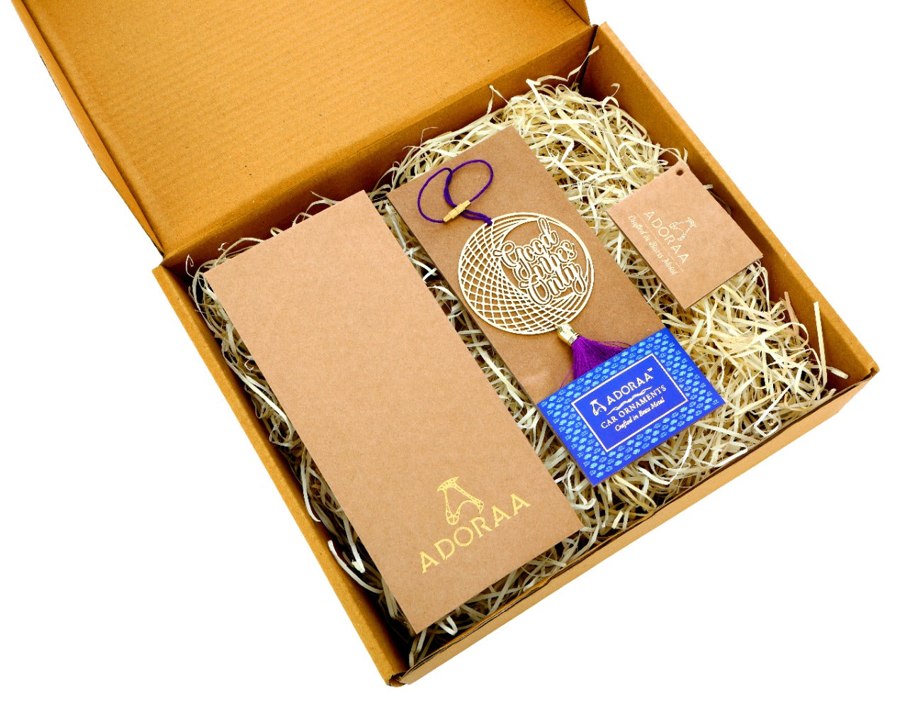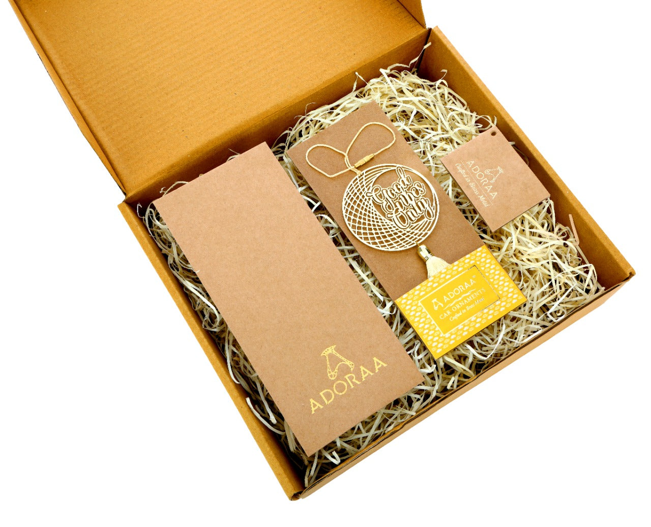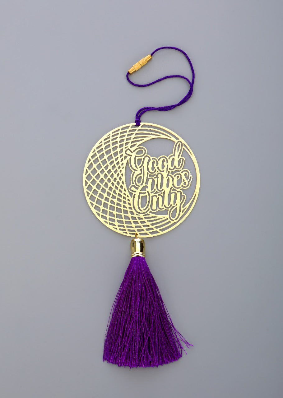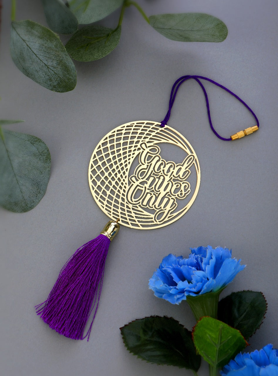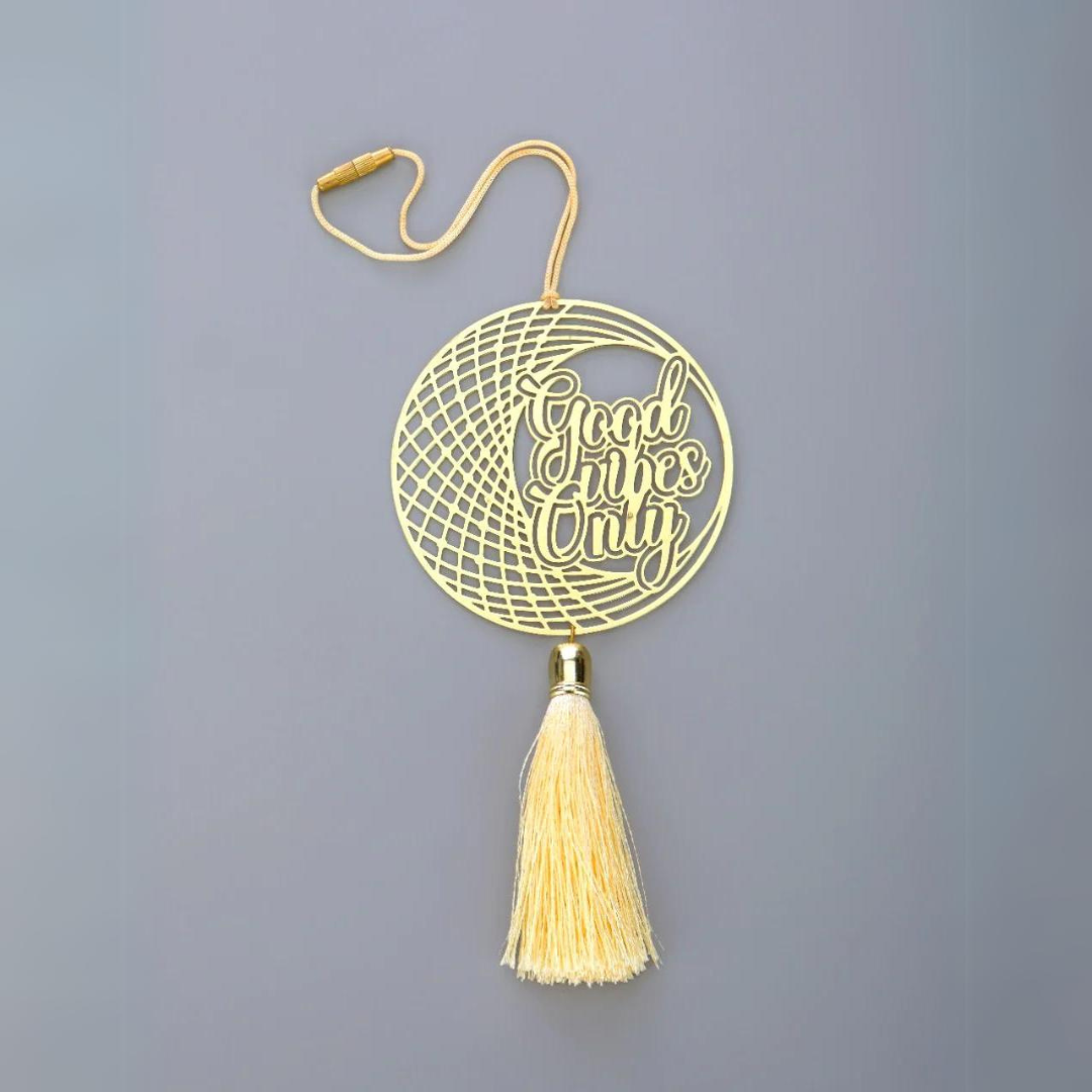 Golden Brass Metal Car Hanging rear view mirror Accessory/Décor with Red Dori & Tassel. Handcrafted, by women artisans. Exclusive collection of Elegant design Automotive Rear View Mirror charm for your special car. Great decoration for car and perfect Gift for your friend, family and lover