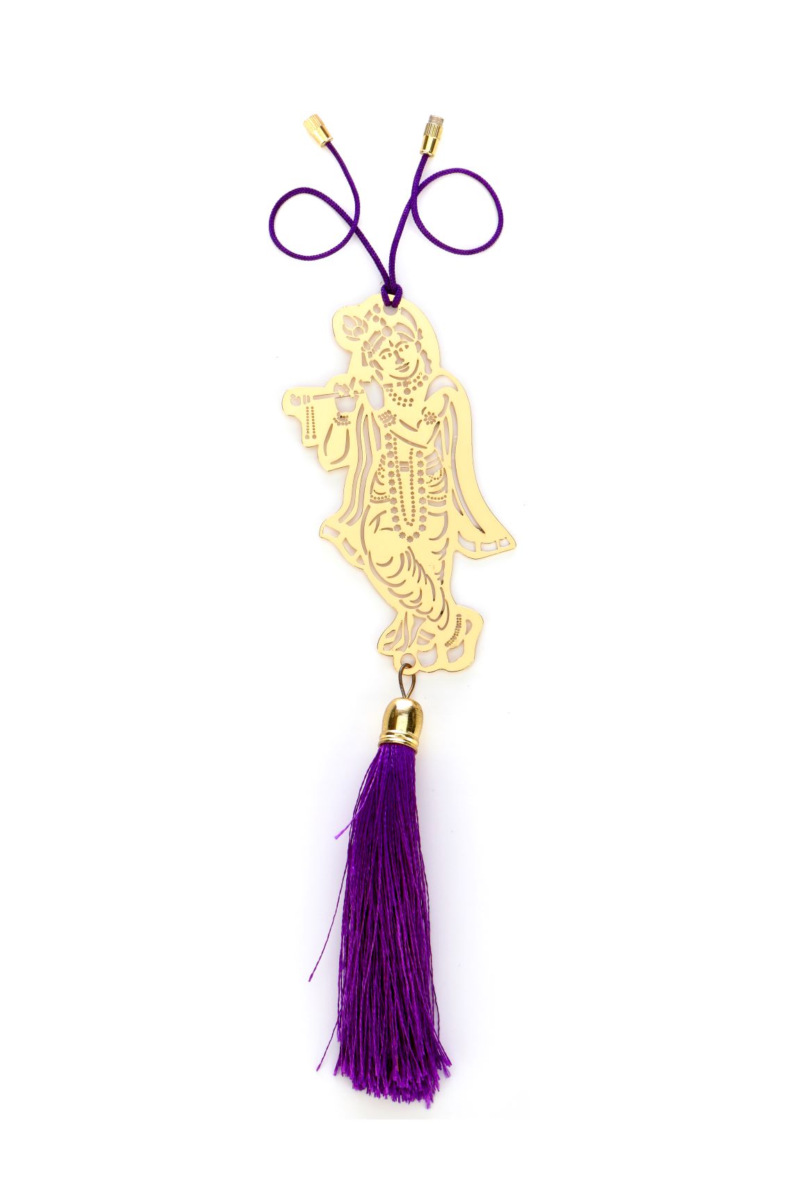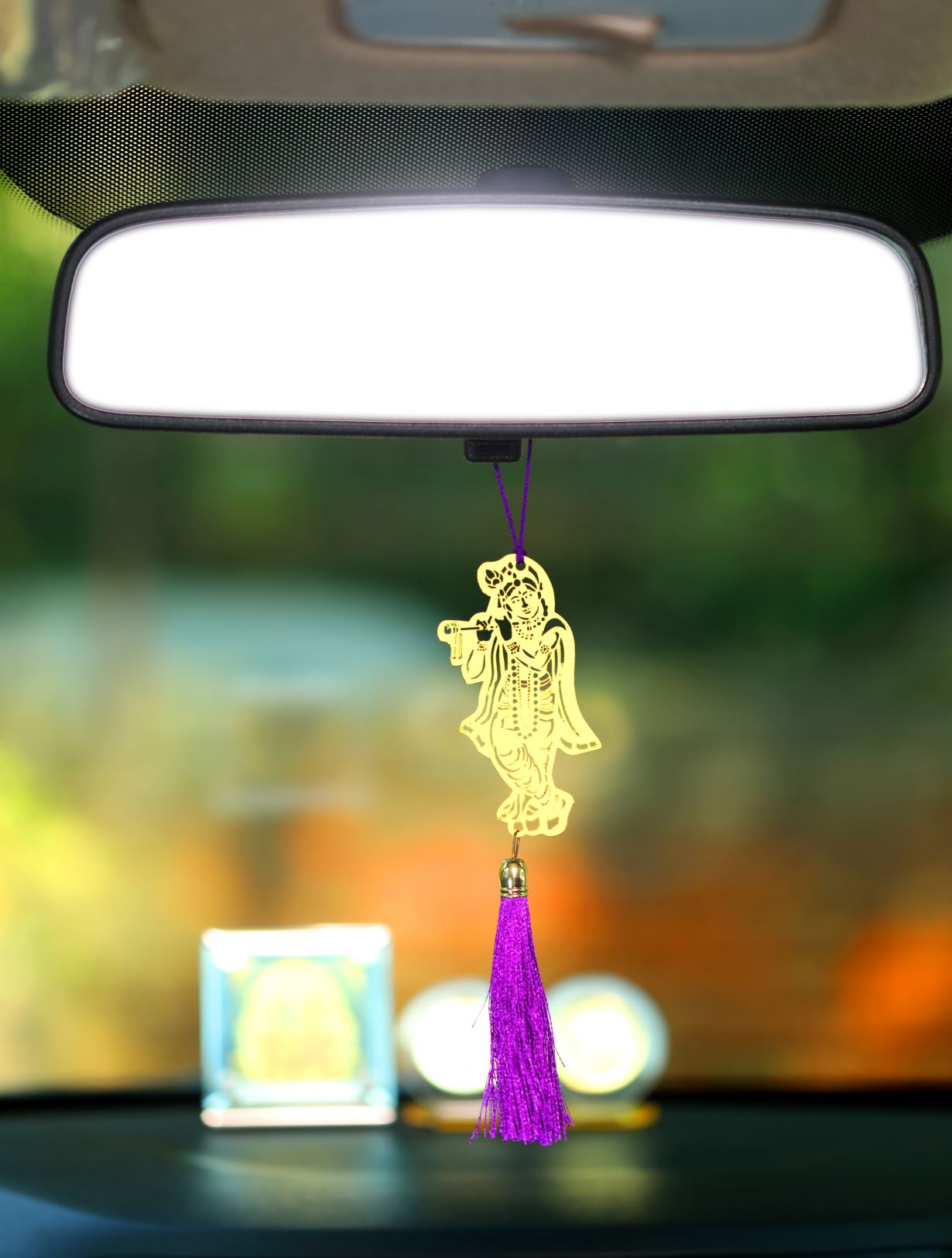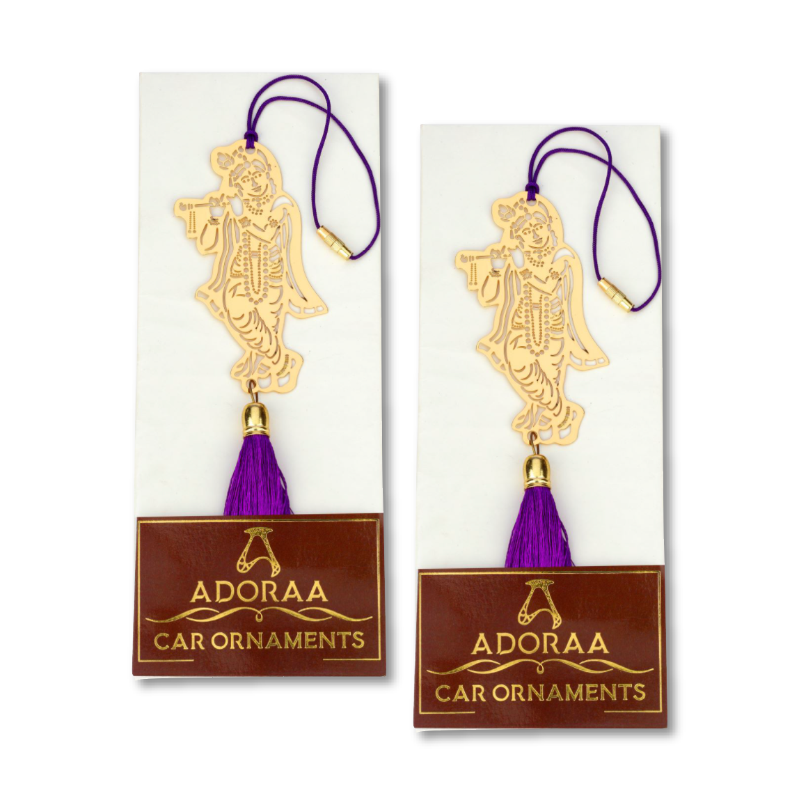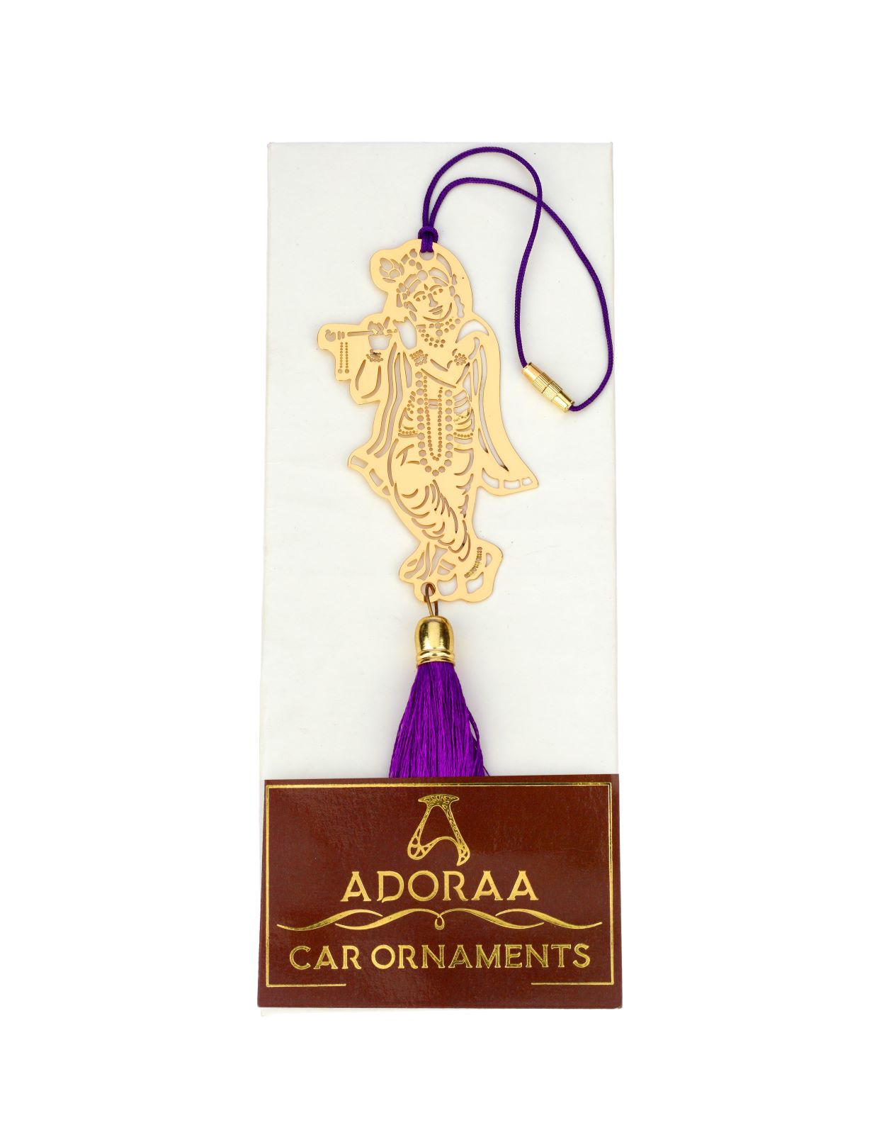 ADORAA's Hindu God Shri Krishna/Krishan Kanihiya Hanging Accessories for Car rear view mirror Decor in Brass with purple tassel and dori. Handcrafted, by women artisans. Exclusive collection of Elegant design Automotive Rear View Mirror charm for your special car. Great decoration for car and perfect Gift for your friend, family and lover.