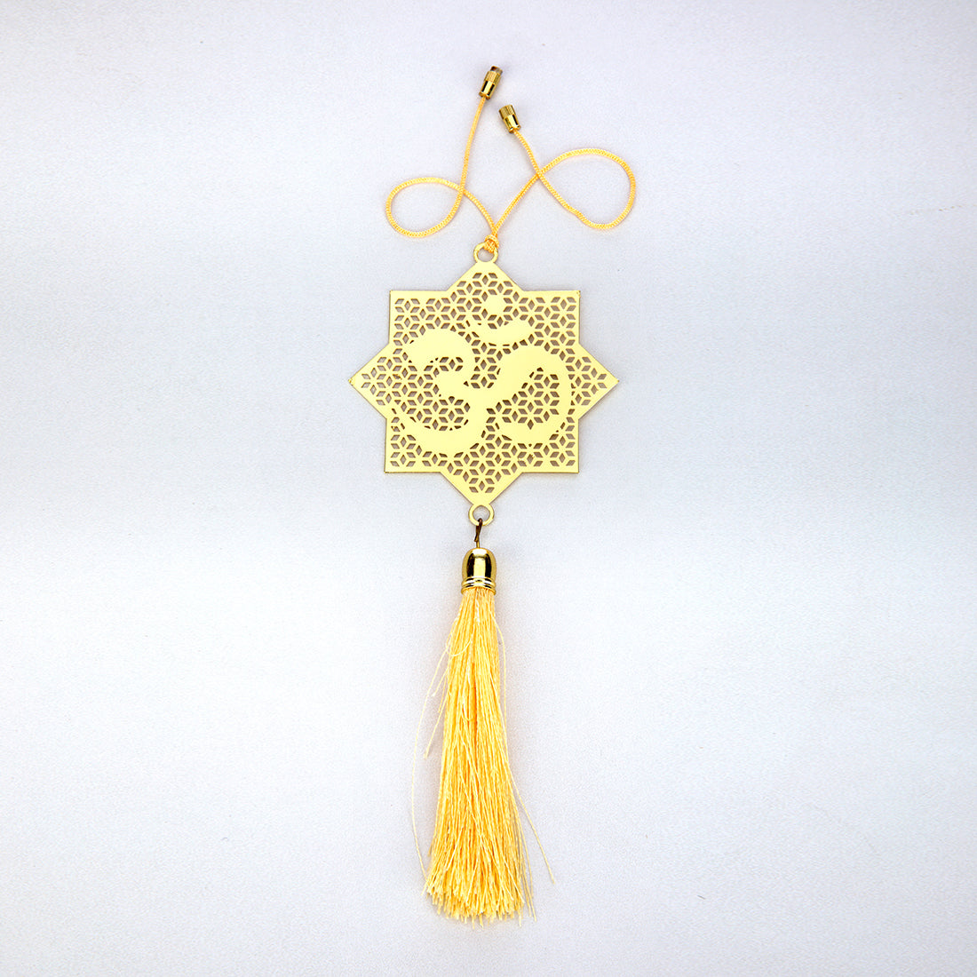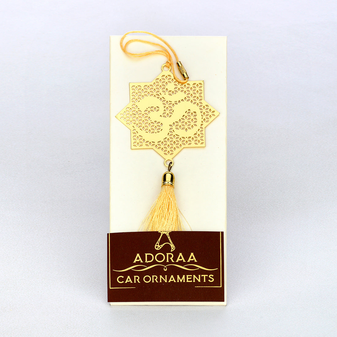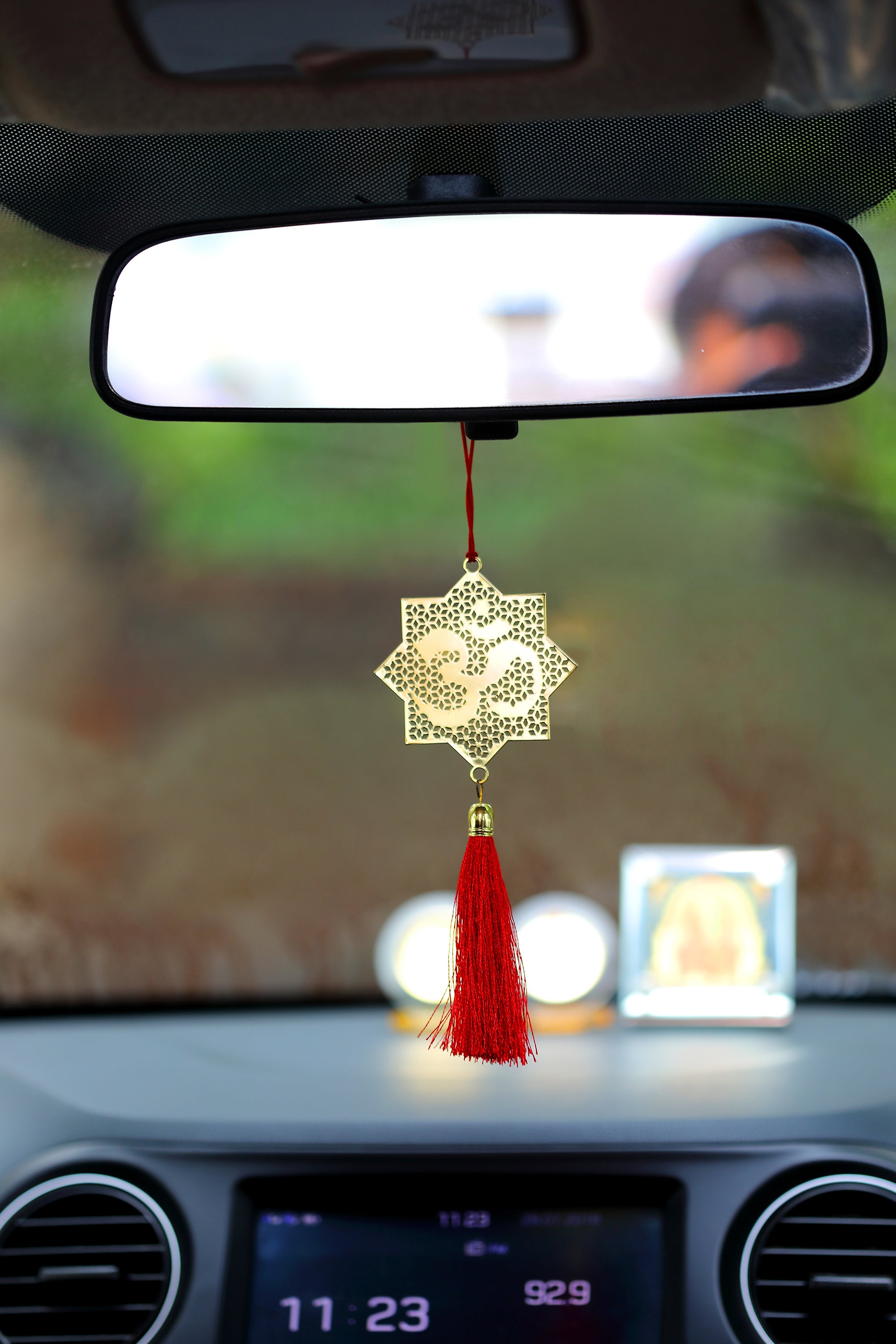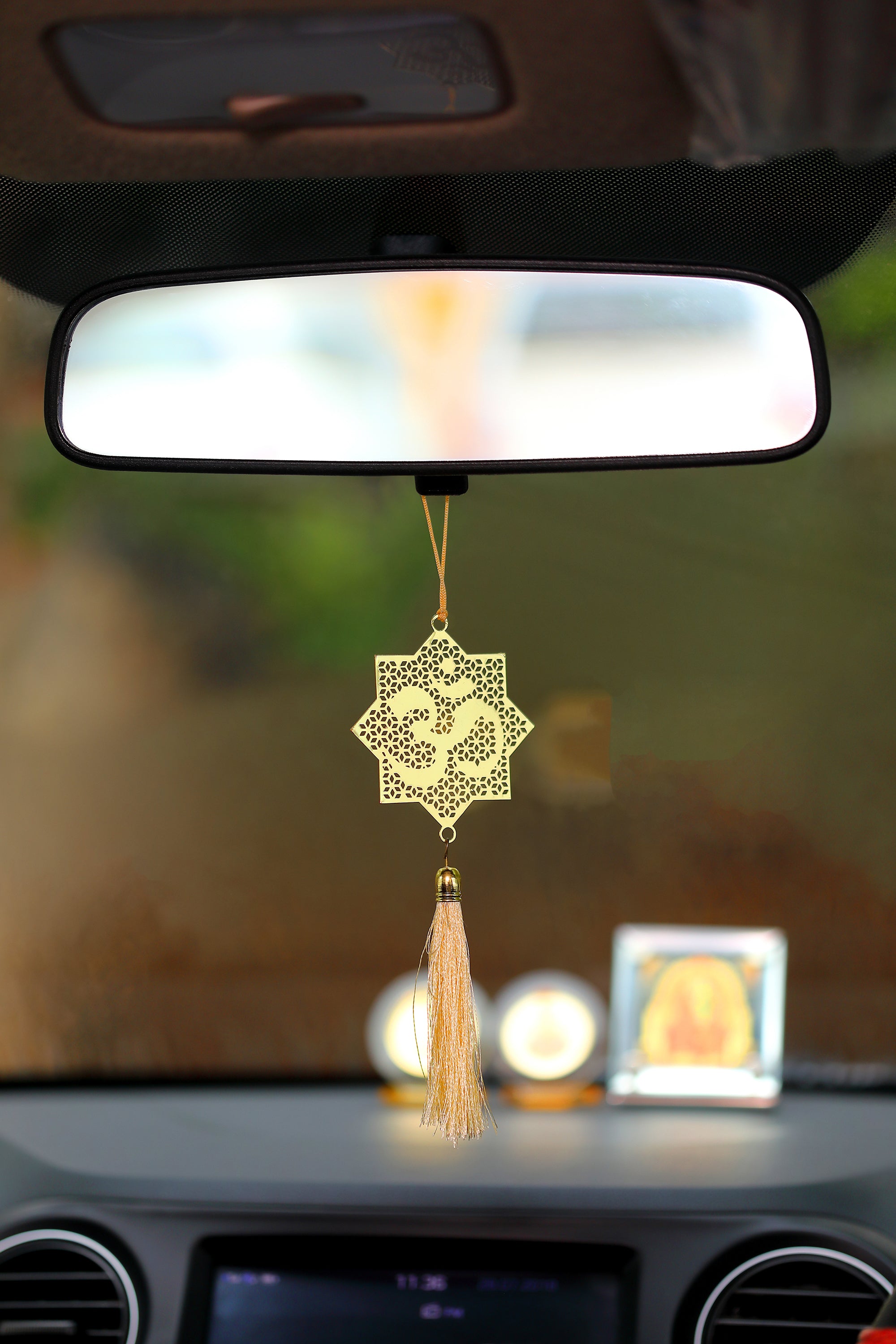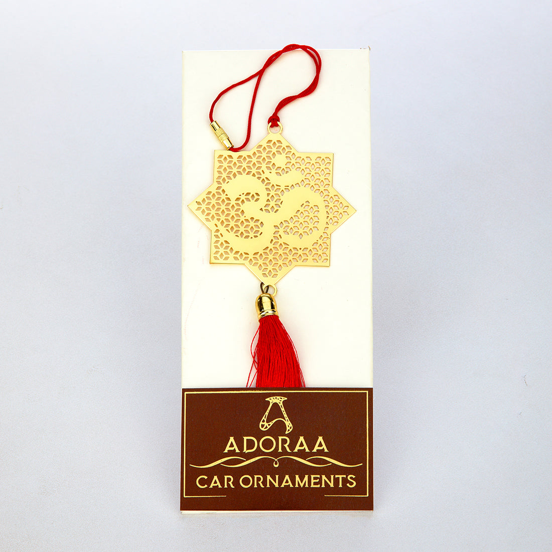 OM Symbol Pattern Golden Brass Metal Car Hanging rear view mirror Accessory/Décor with Red Dori & Tassel . Exclusive collection of Elegant design Automotive Rear View Mirror charm for your special car. Great decoration for car and perfect Gift for your friend, family and lover.