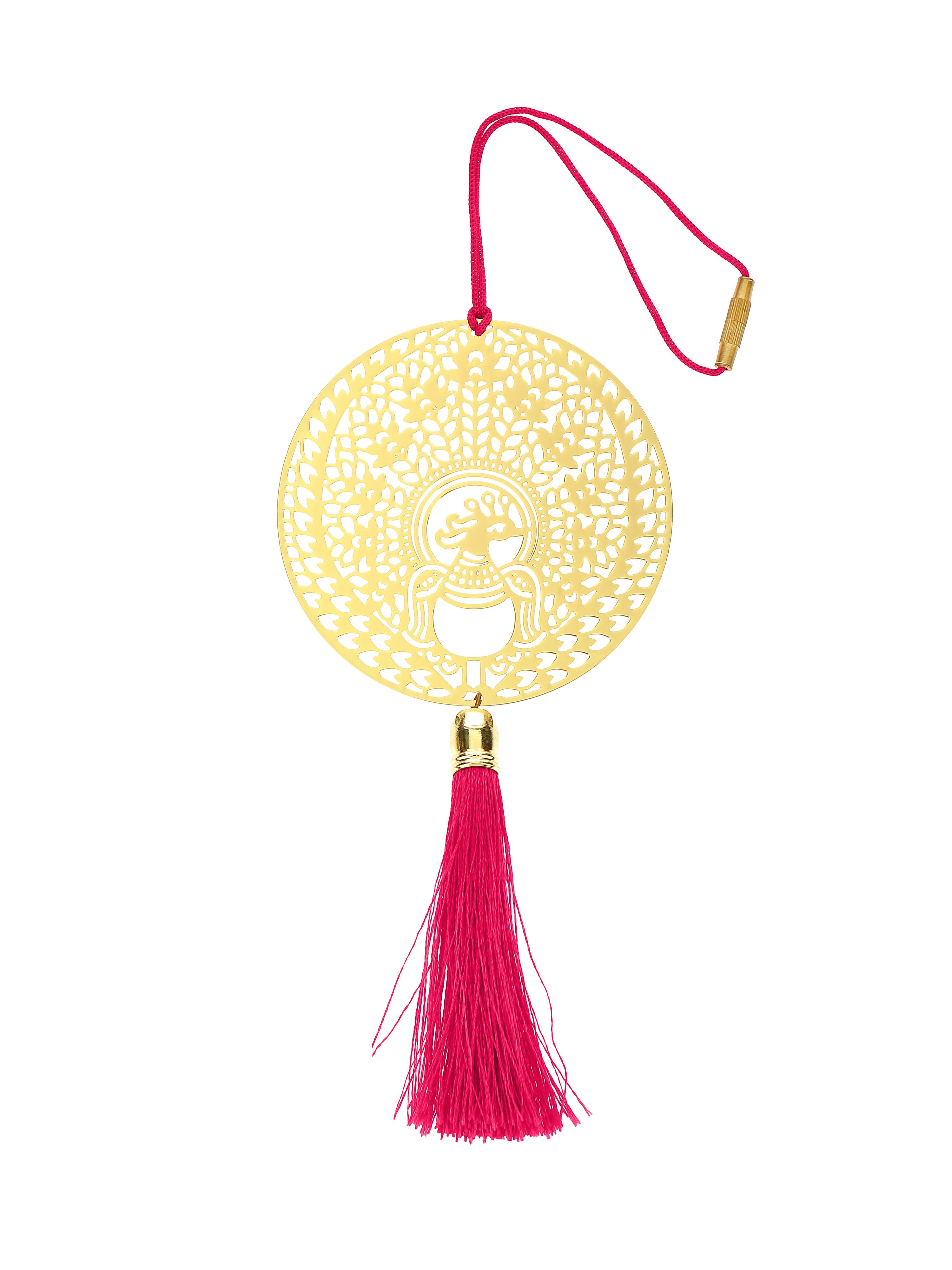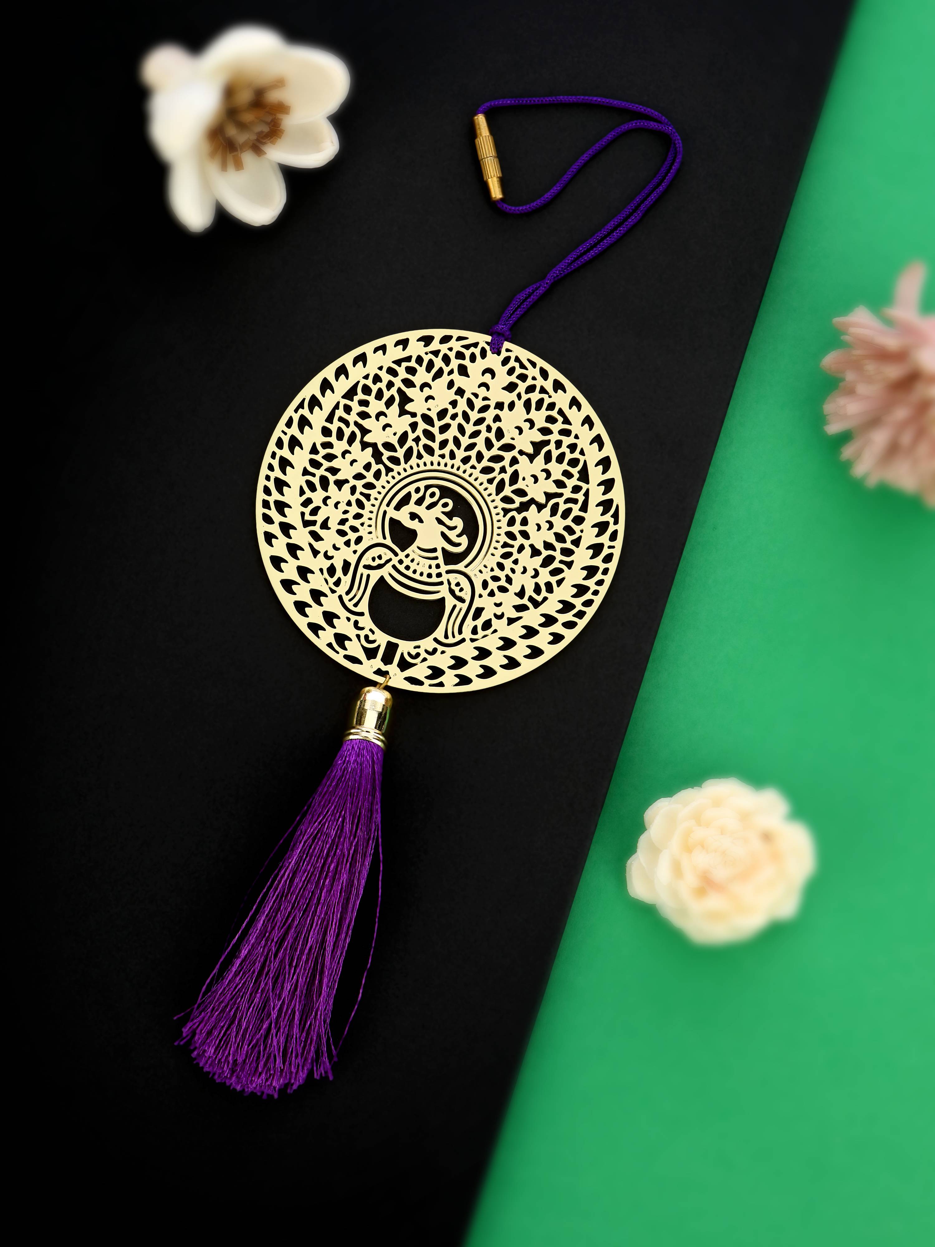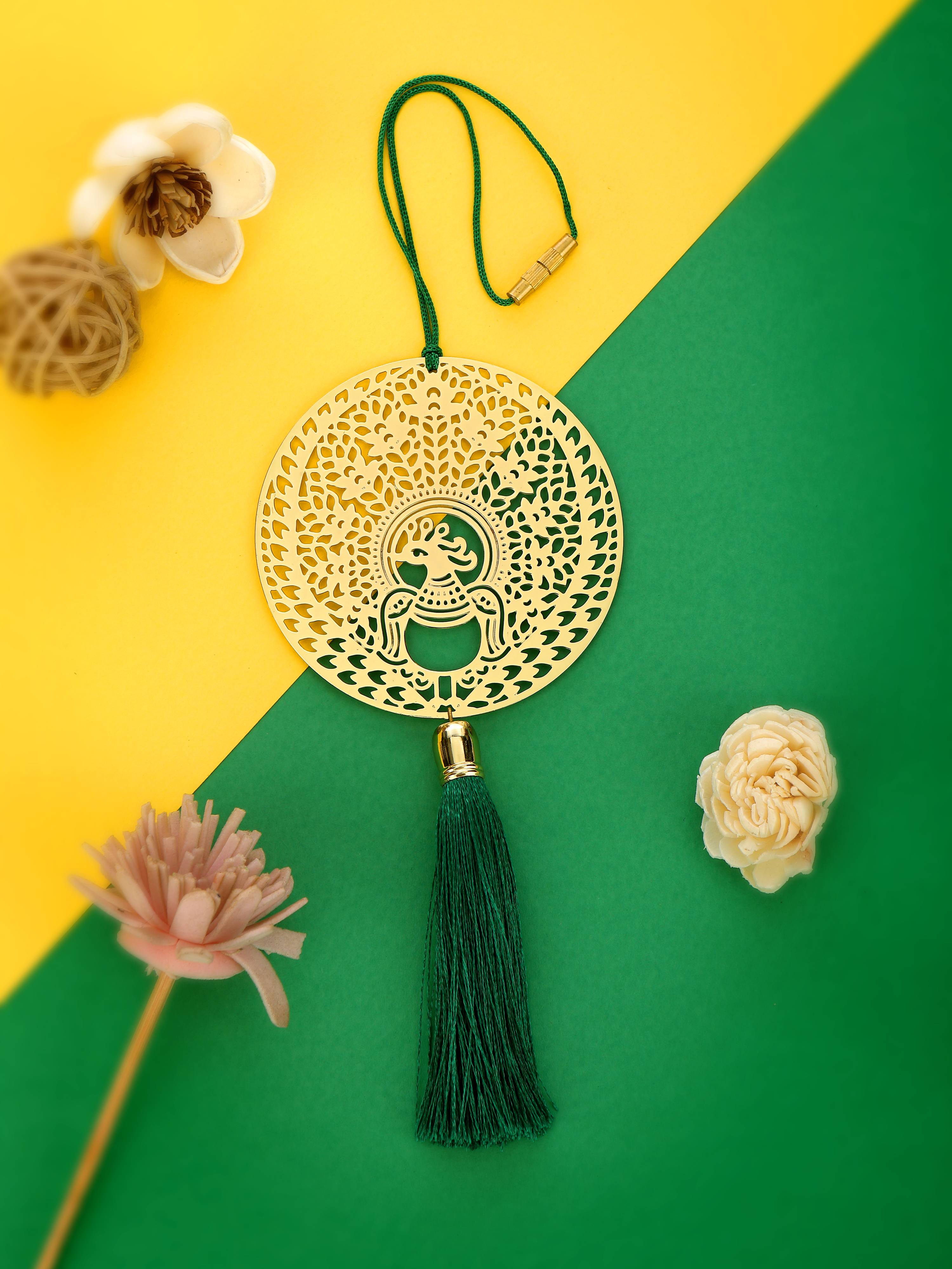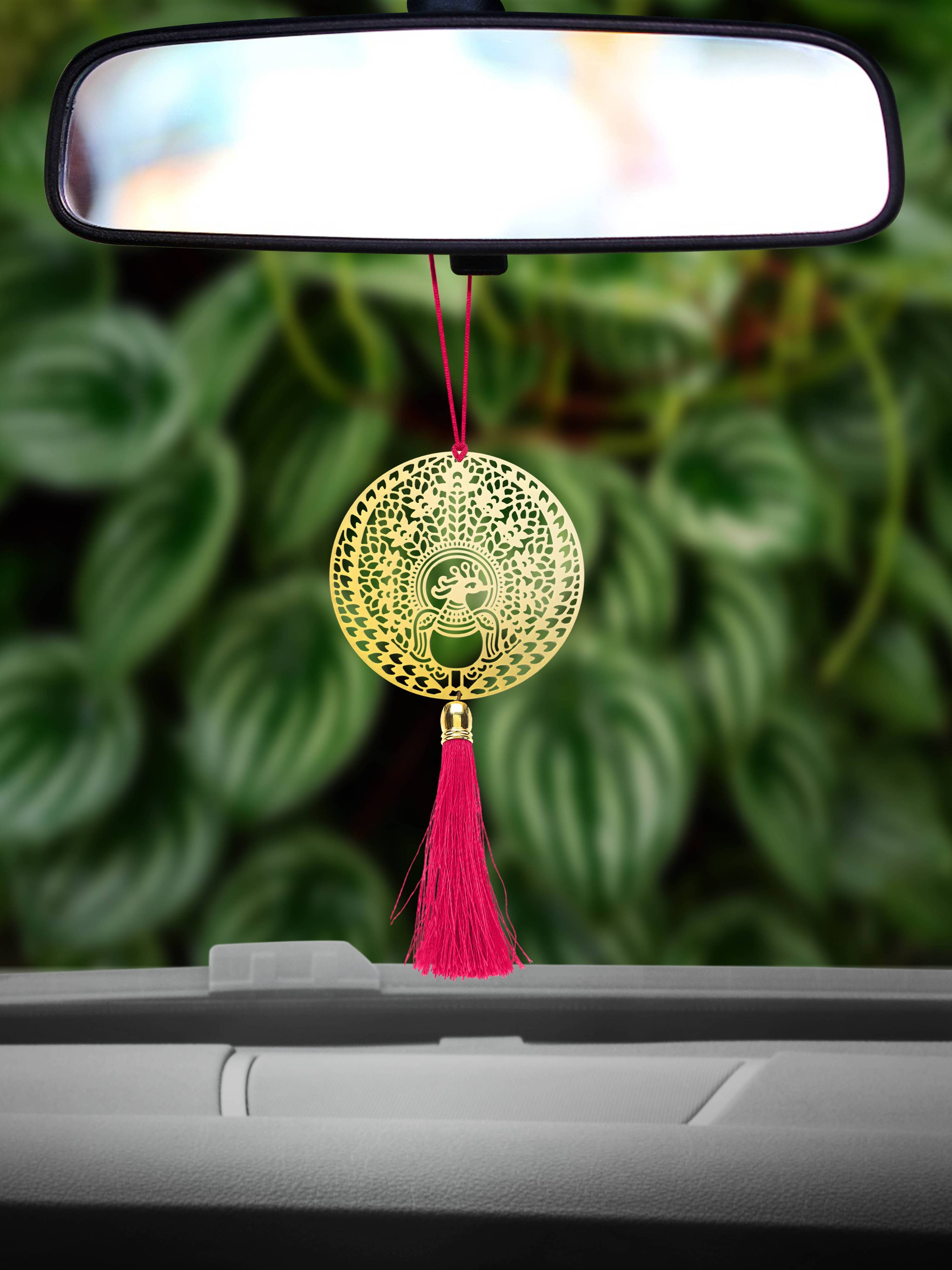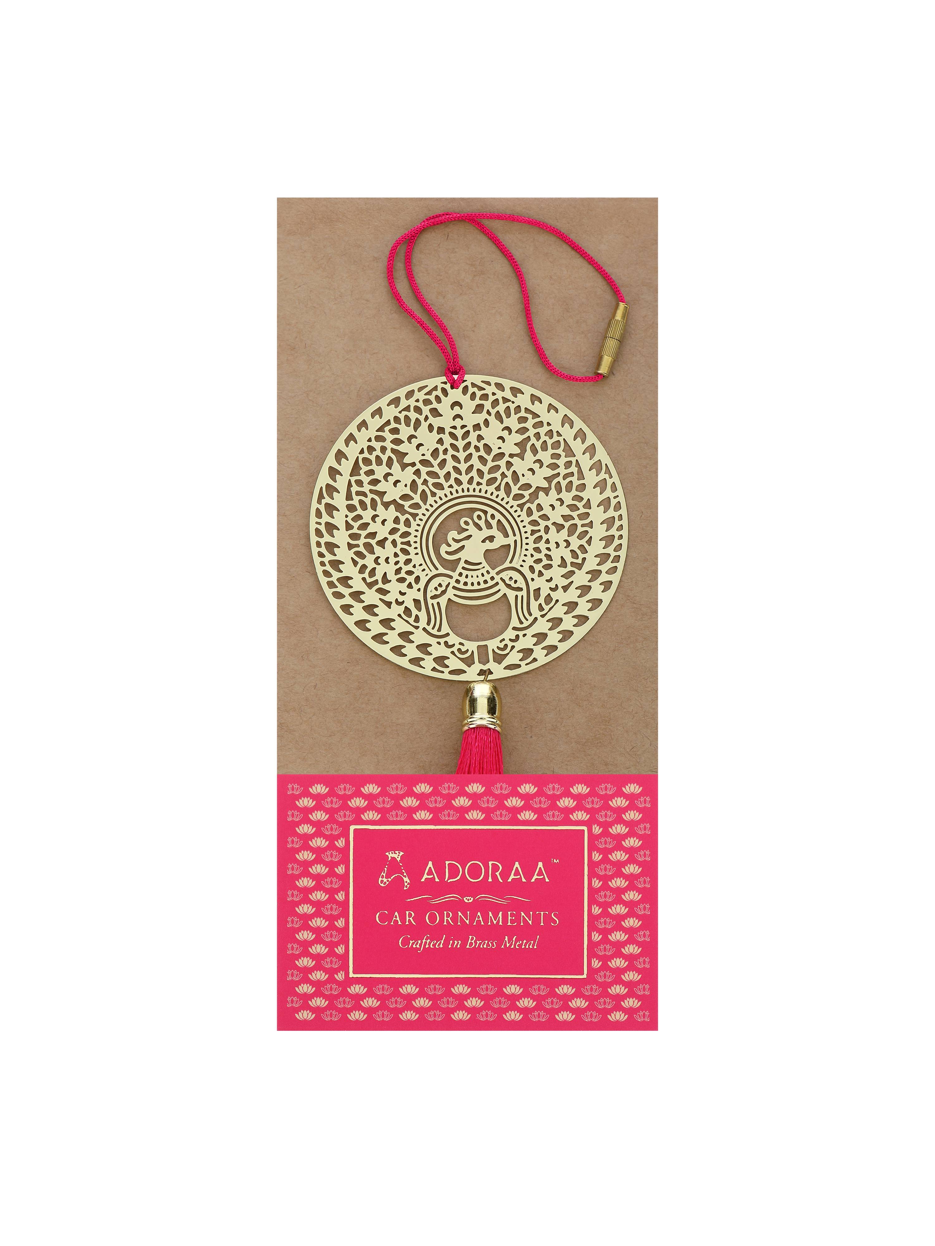 Adoraa's Kalamkaari Peacock Jaali Metal Car Hanging rear view mirror Accessory/Décor in brass with satin dori & tassel. Handcrafted, by women artisans. Exclusive collection of Elegant design Automotive Rear View Mirror charm for your special car. Great decoration for car and the perfect gift for your friend, family, and lover. This car hanging is inspired by Kalamkari Indian Art. It depicts a floral design of the Kalamkari art form with Peacock surrounded by an Intricrate Jaali. It is handcrafted by applying engraving & cutting techniques on brass metal, a skill deeply rooted in Indian metalworking.