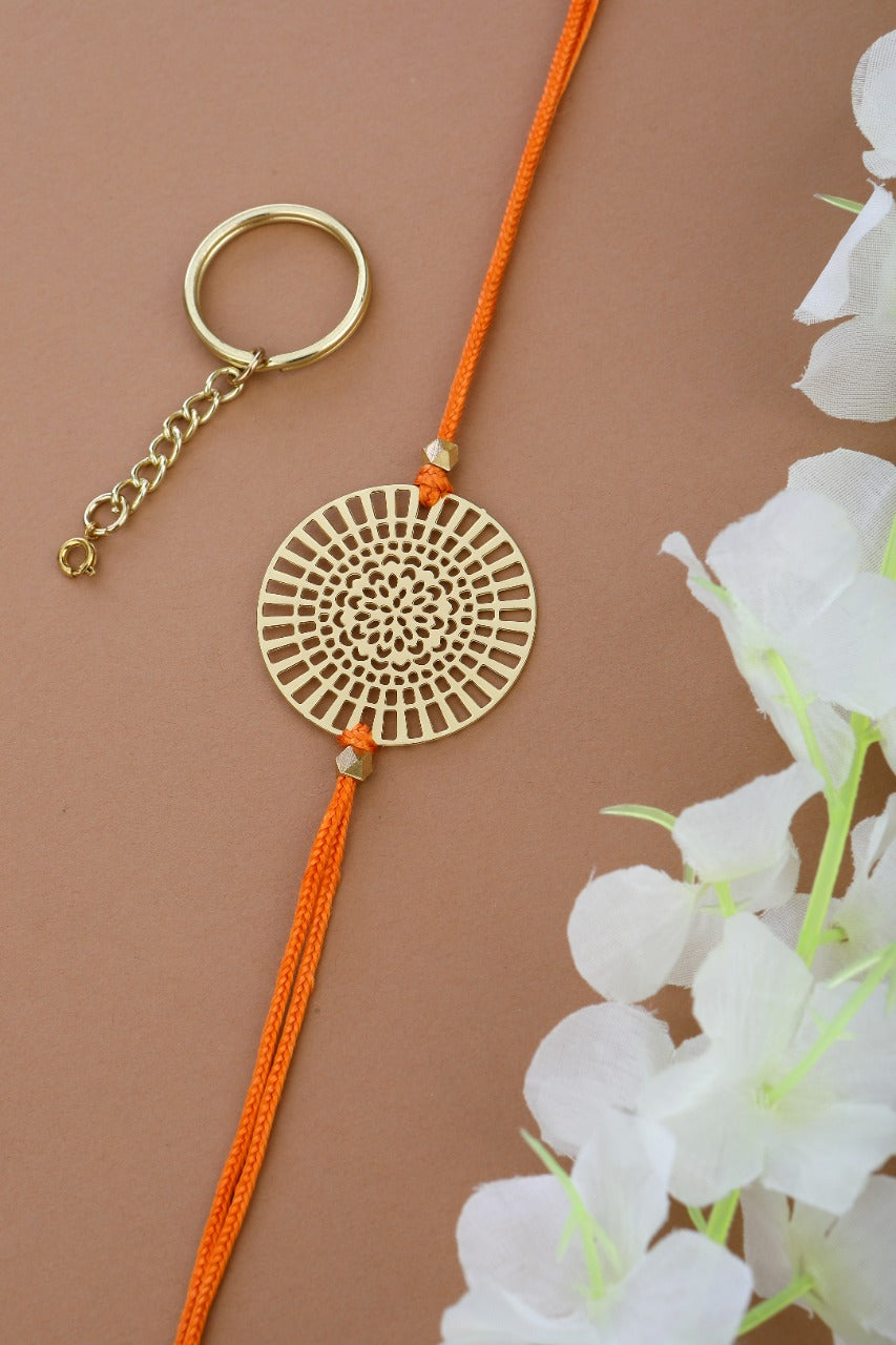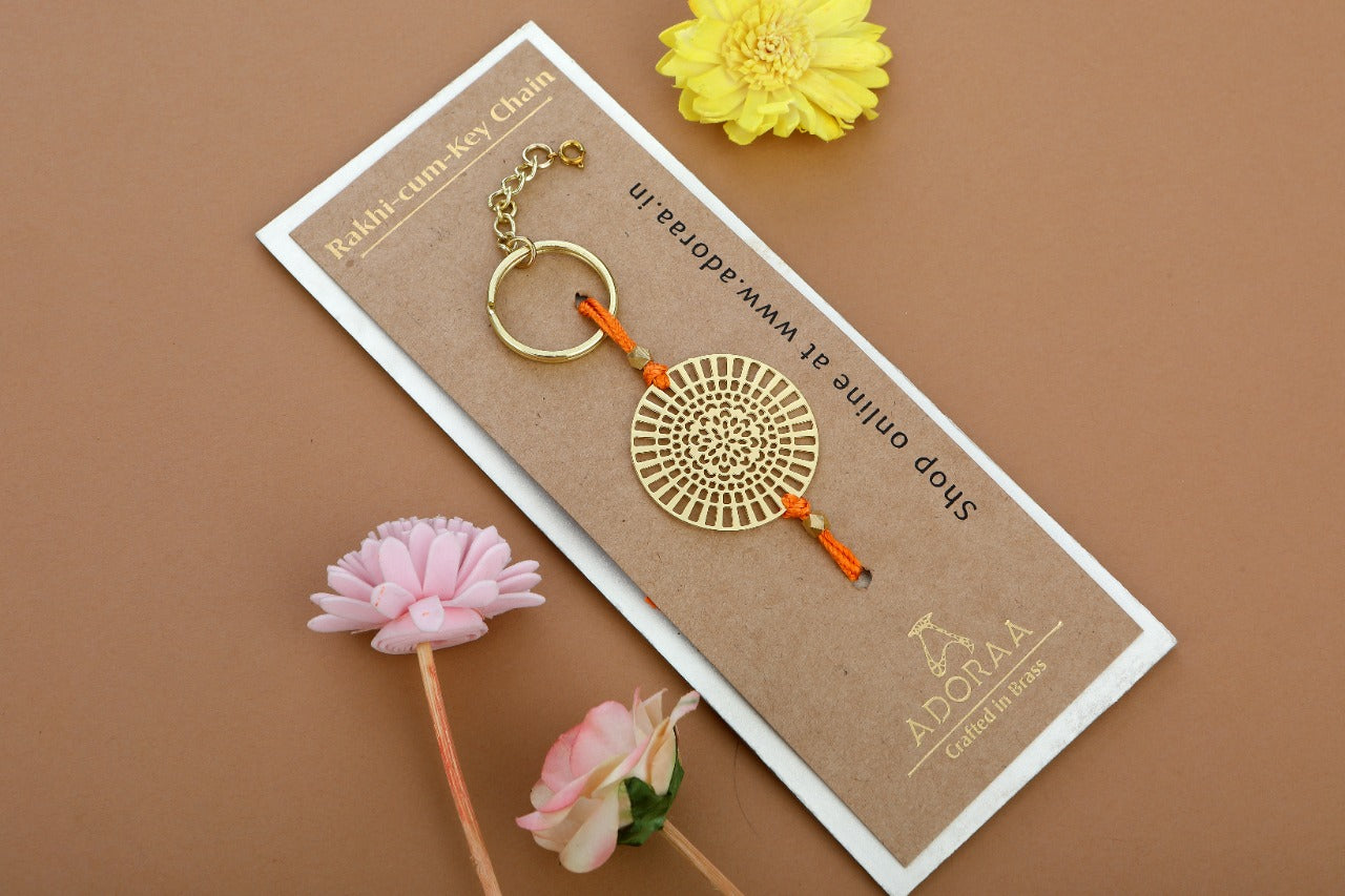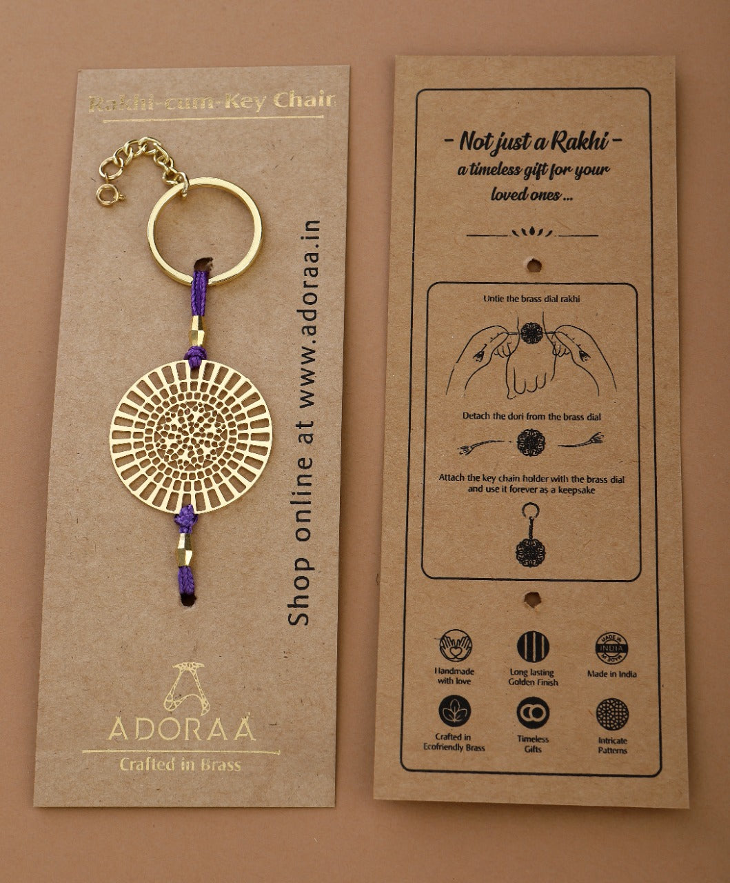 ADORAA's Dial Design Rakhi for bhai/brother. After use you can convert it into a keychain ring for timeless memories. Crafted in brass with golden finish. Intracrately crafted design, can be converted into a keychain. A timeless gifting option for your loved ones