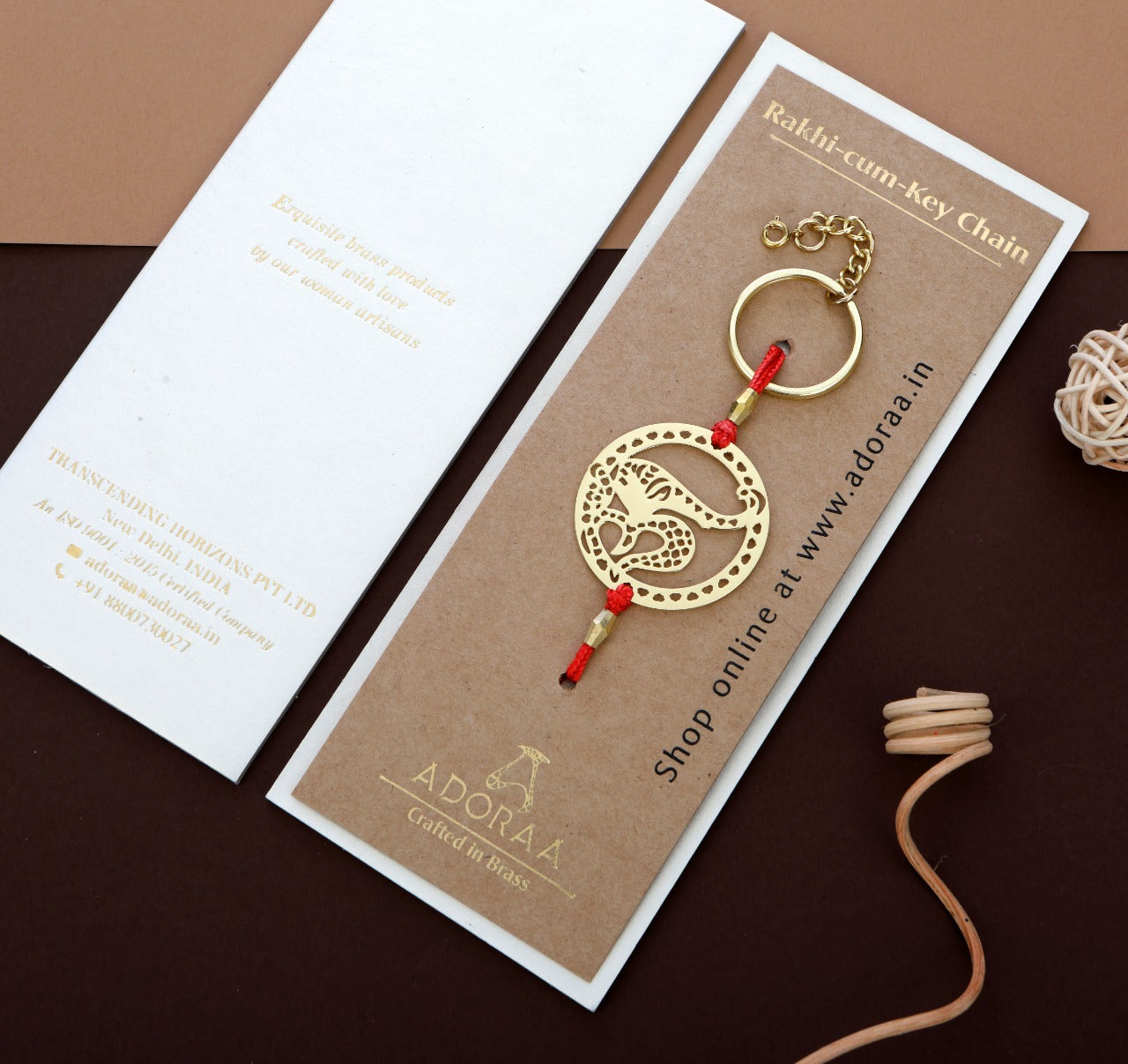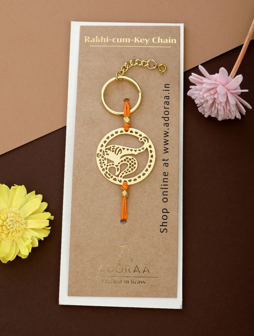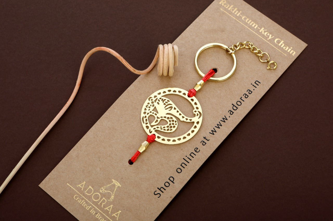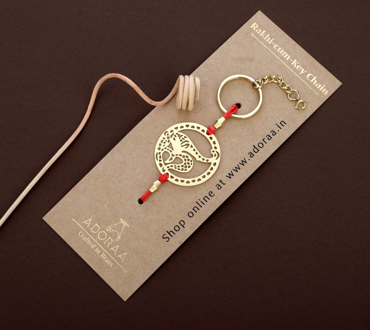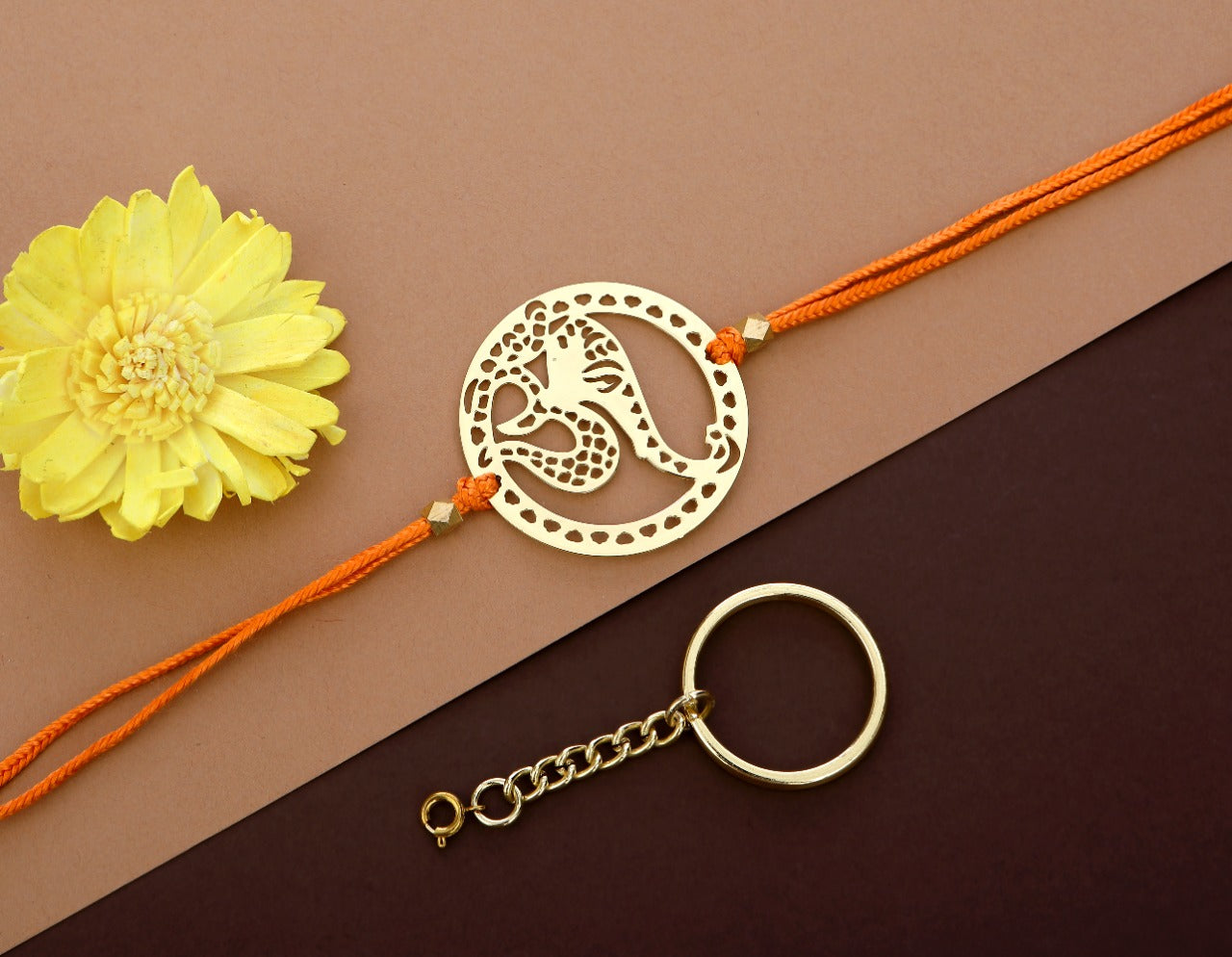 ADORAA's Om Ganesha Design Rakhi for bhai/brother. After use you can convert it into a keychain ring for timeless memories. Crafted in brass with golden finish. Intracrately crafted design, can be converted into a keychain. A timeless gifting option for your loved ones