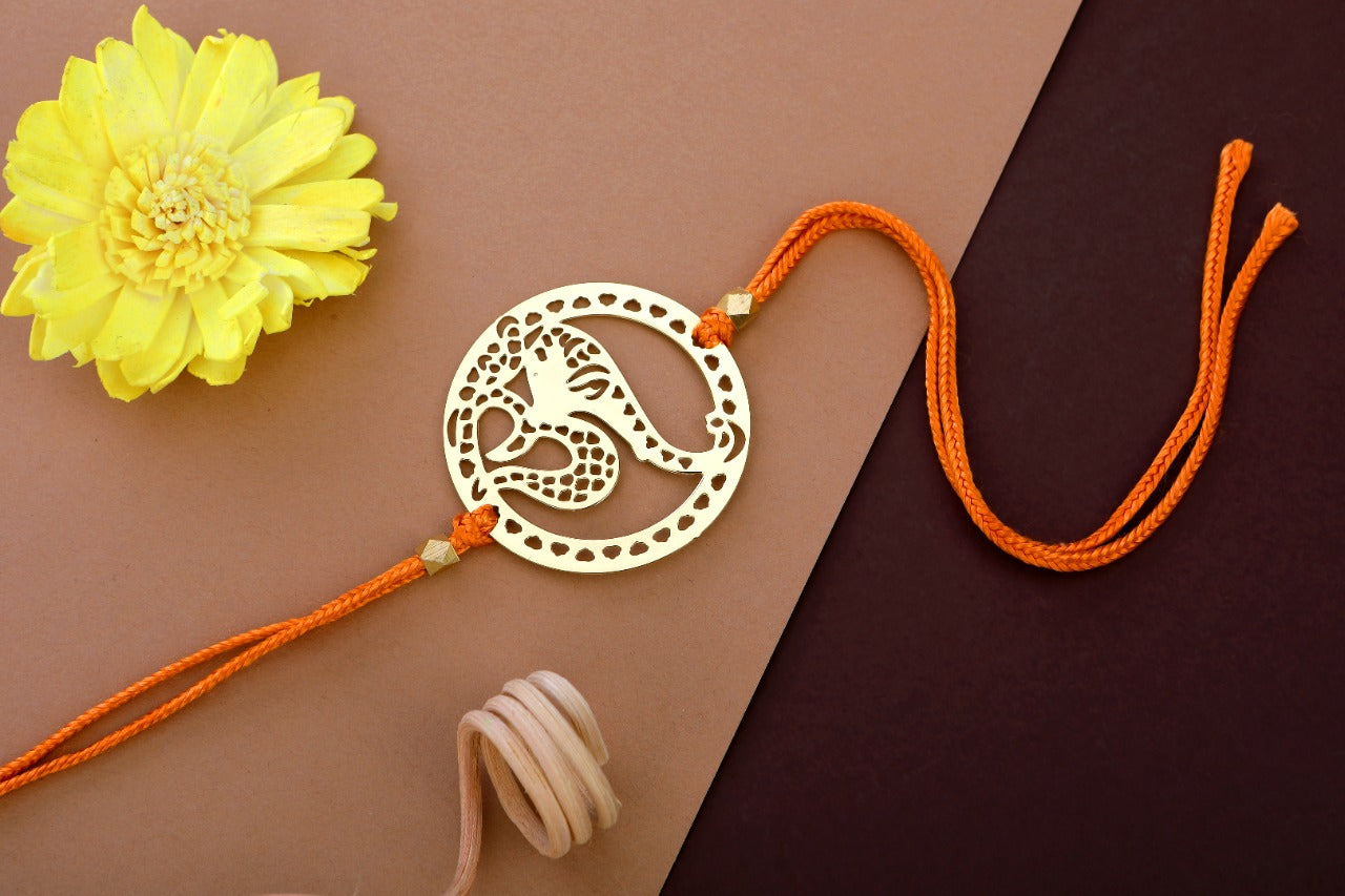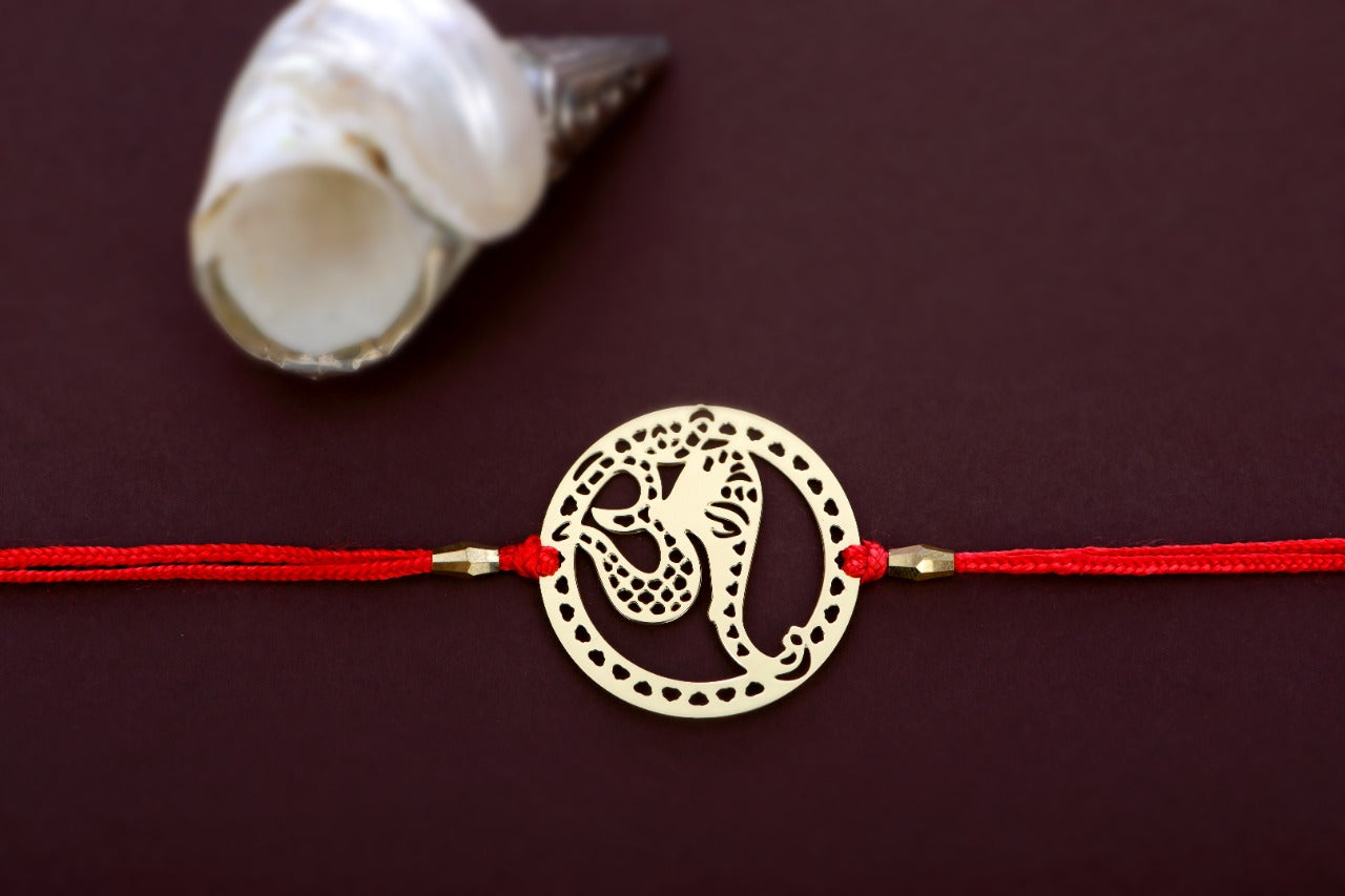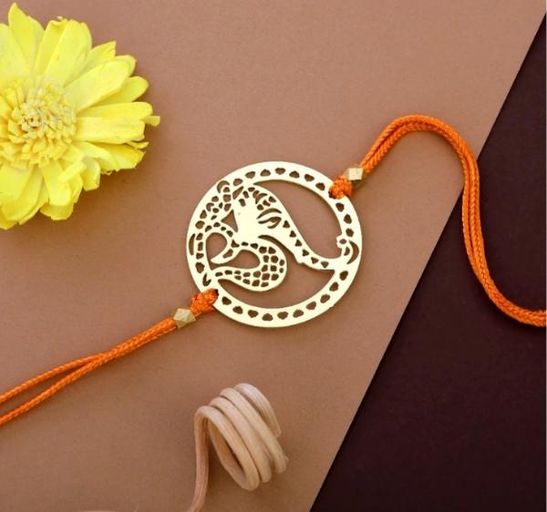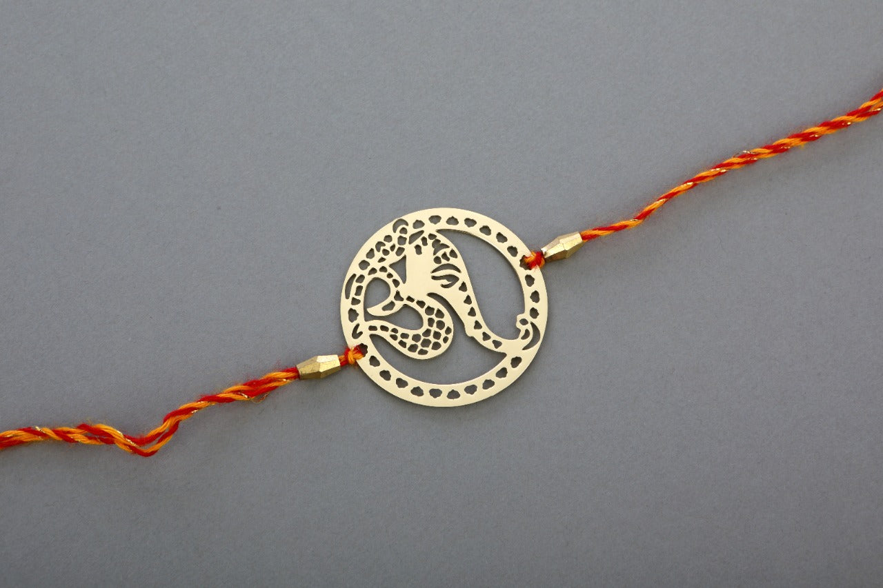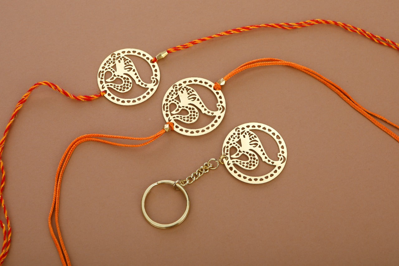 ADORAA's Om Ganesha Design Rakhi for bhai/brother. After use you can convert it into a keychain ring for timeless memories. Crafted in brass with golden finish. Intracrately crafted design, can be converted into a keychain. A timeless gifting option for your loved ones