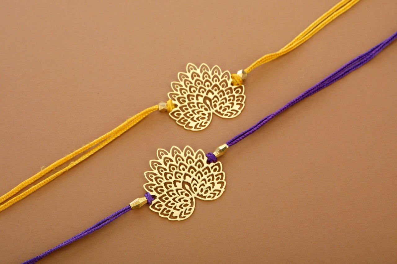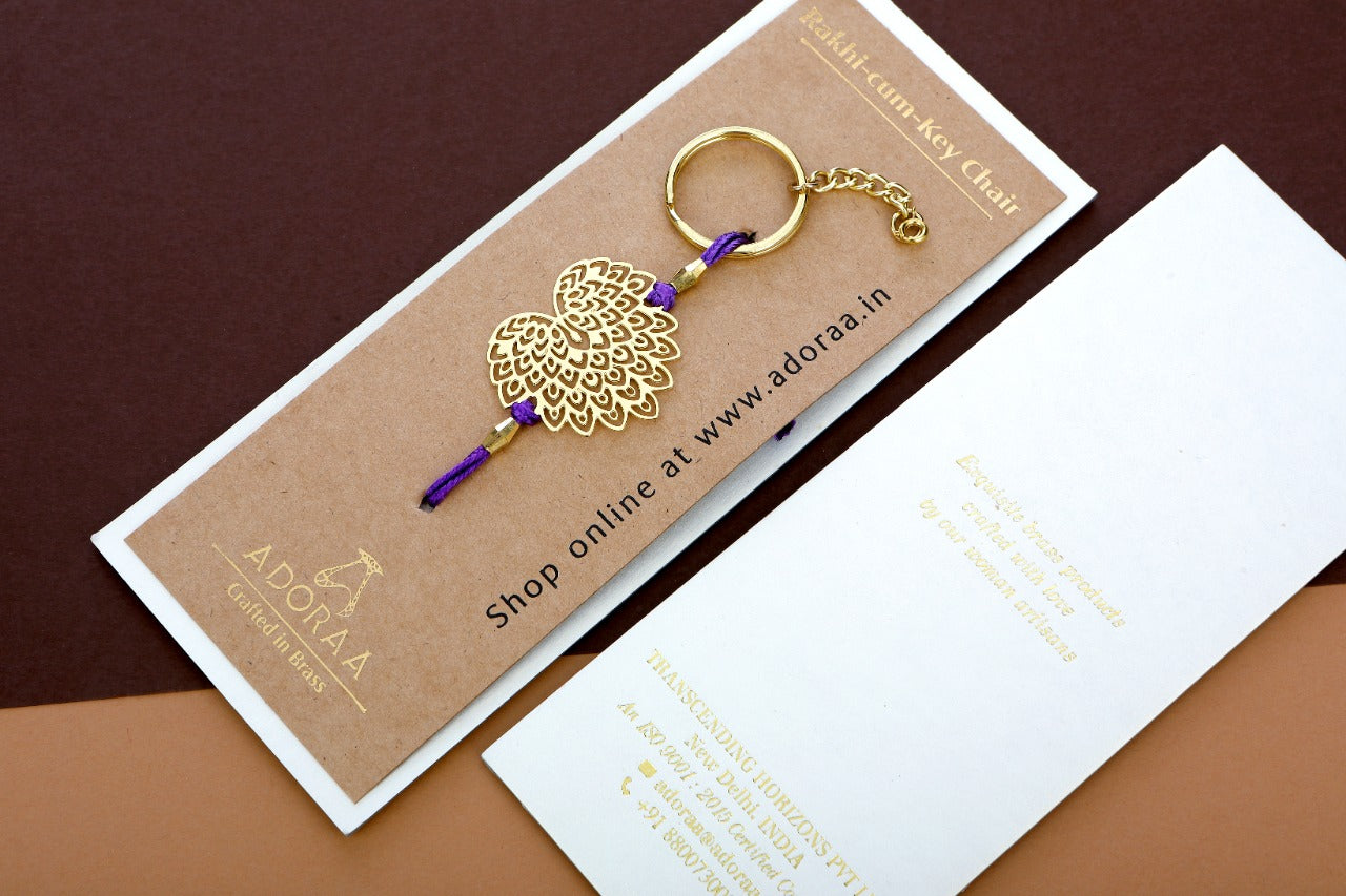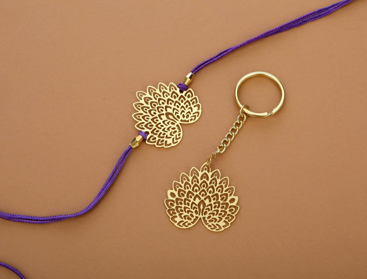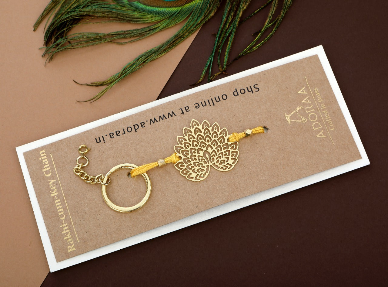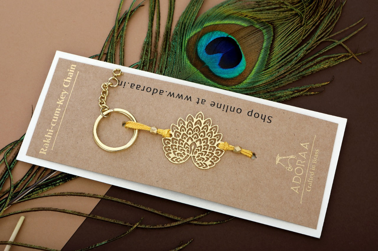 ADORAA's Peacock Design Rakhi for bhai/brother. After use you can convert it into a keychain ring for timeless memories. Crafted in brass with golden finish. Intracrately crafted design, can be converted into a keychain. A timeless gifting option for your loved ones