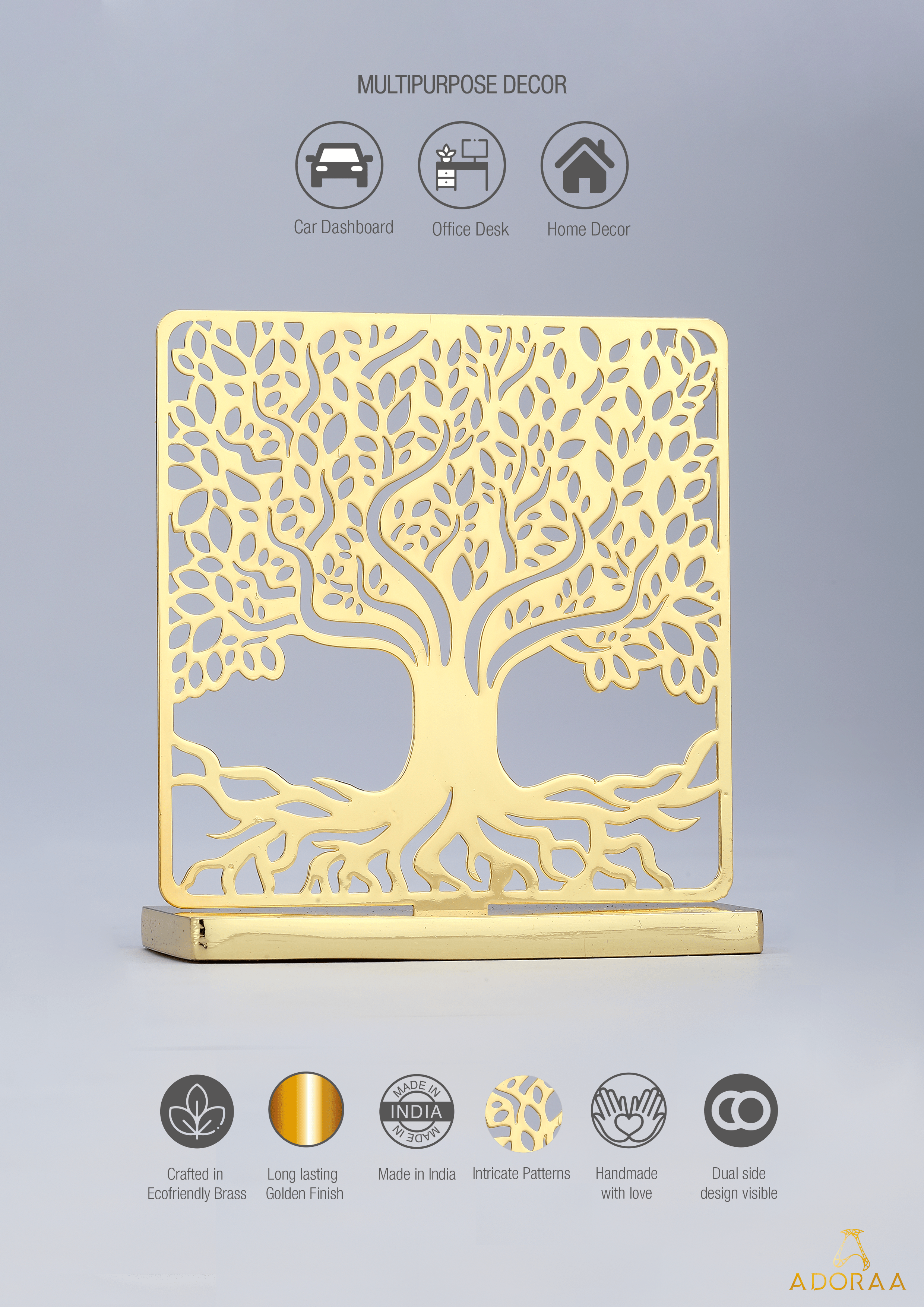 ADORAA's Tree of Life Desk/Car Dashboard/Temple Décor crafted in brass with golden finish. Intracrately crafted design, multiutility décor for car dashboard, office desk, home side tables/study tables. Unique gift for your loved ones