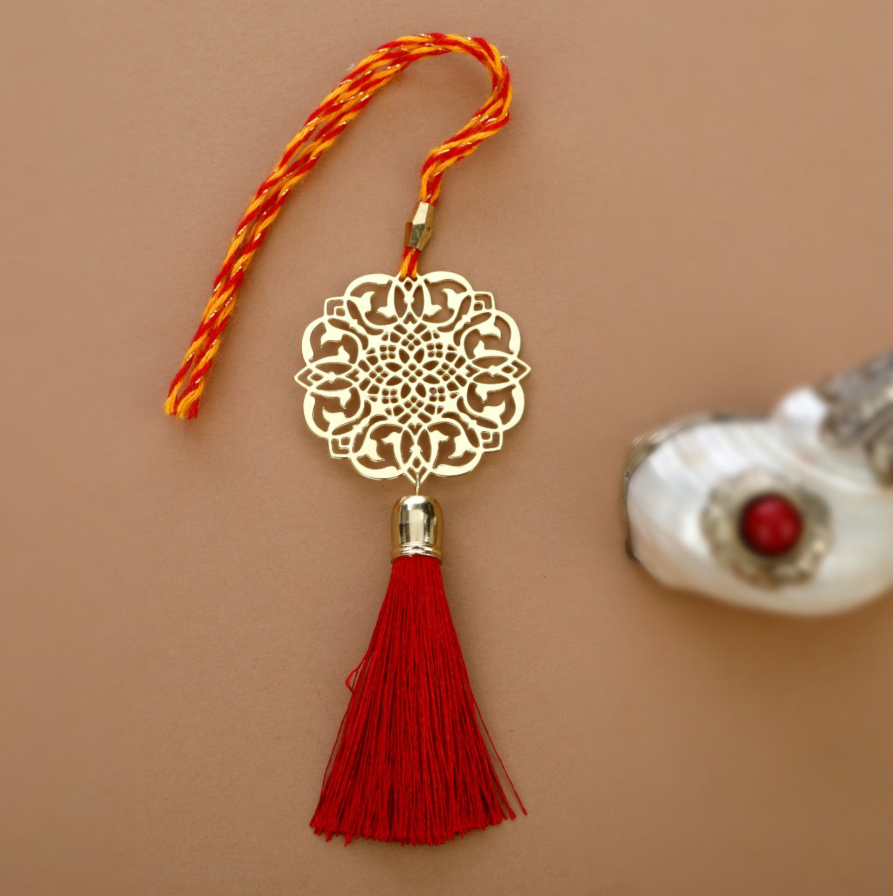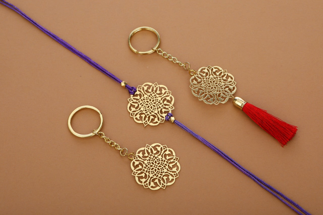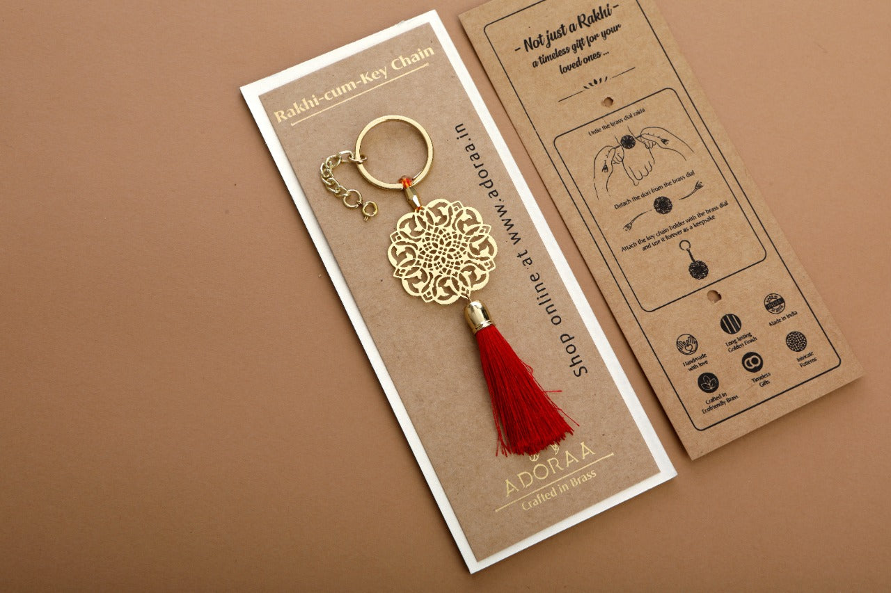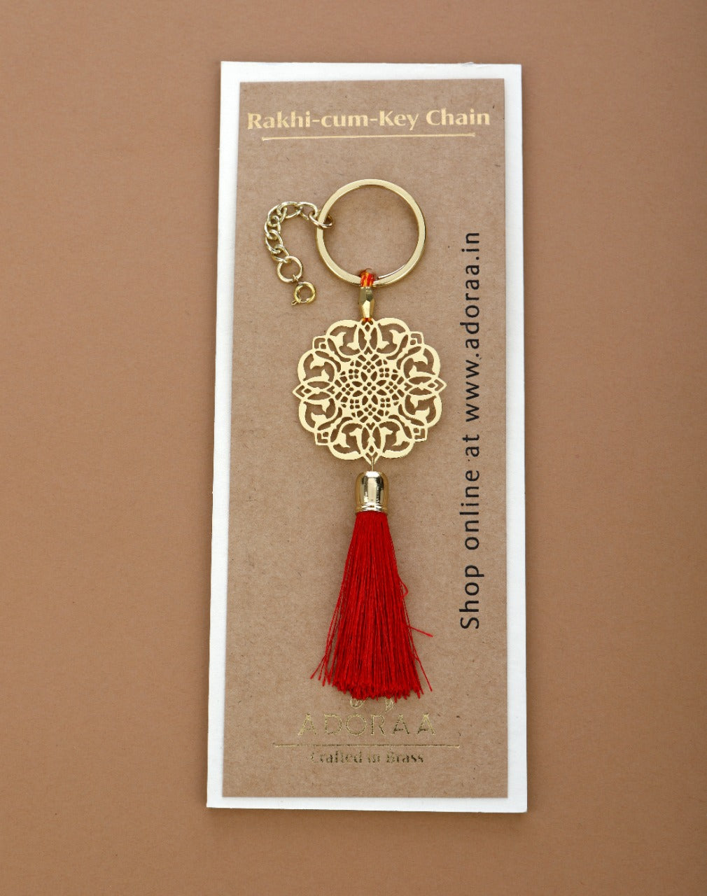 ADORAA's Jaali Design Rakhi for your bhabhi with hanging tassel. After use you can convert it into a keychain ring for timeless memories. Crafted in brass with golden finish. Intracrately crafted design, can be converted into a keychain. A timeless gifting option for your loved ones