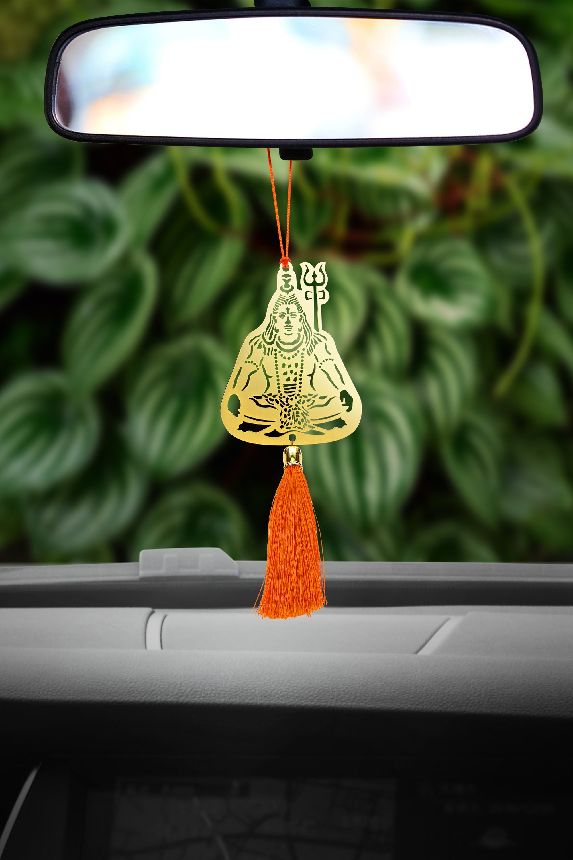 ADORAA's Hindu God Shiva/Mahadev/Shivji/Bholenath Hanging Accessories for Car rear view mirror Decor in Brass with red tassel and dori. Handcrafted, by women artisans. Exclusive collection of Elegant design Automotive Rear View Mirror charm for your special car. Great decoration for car and perfect Gift for your friend, family and lover