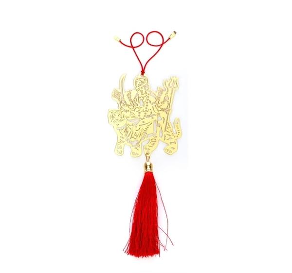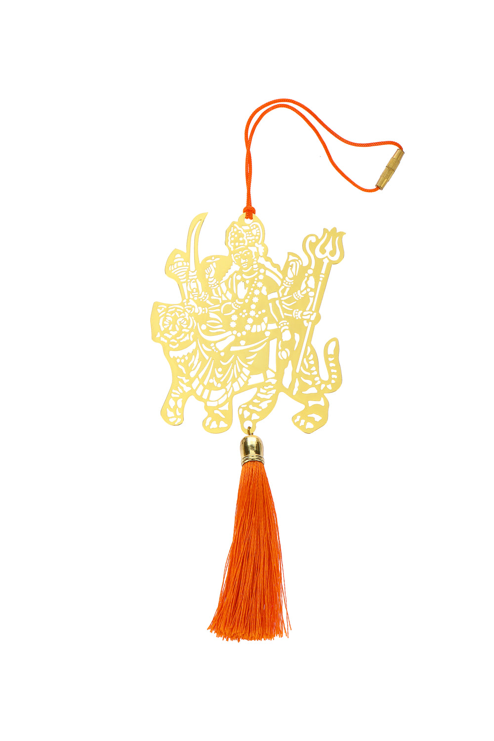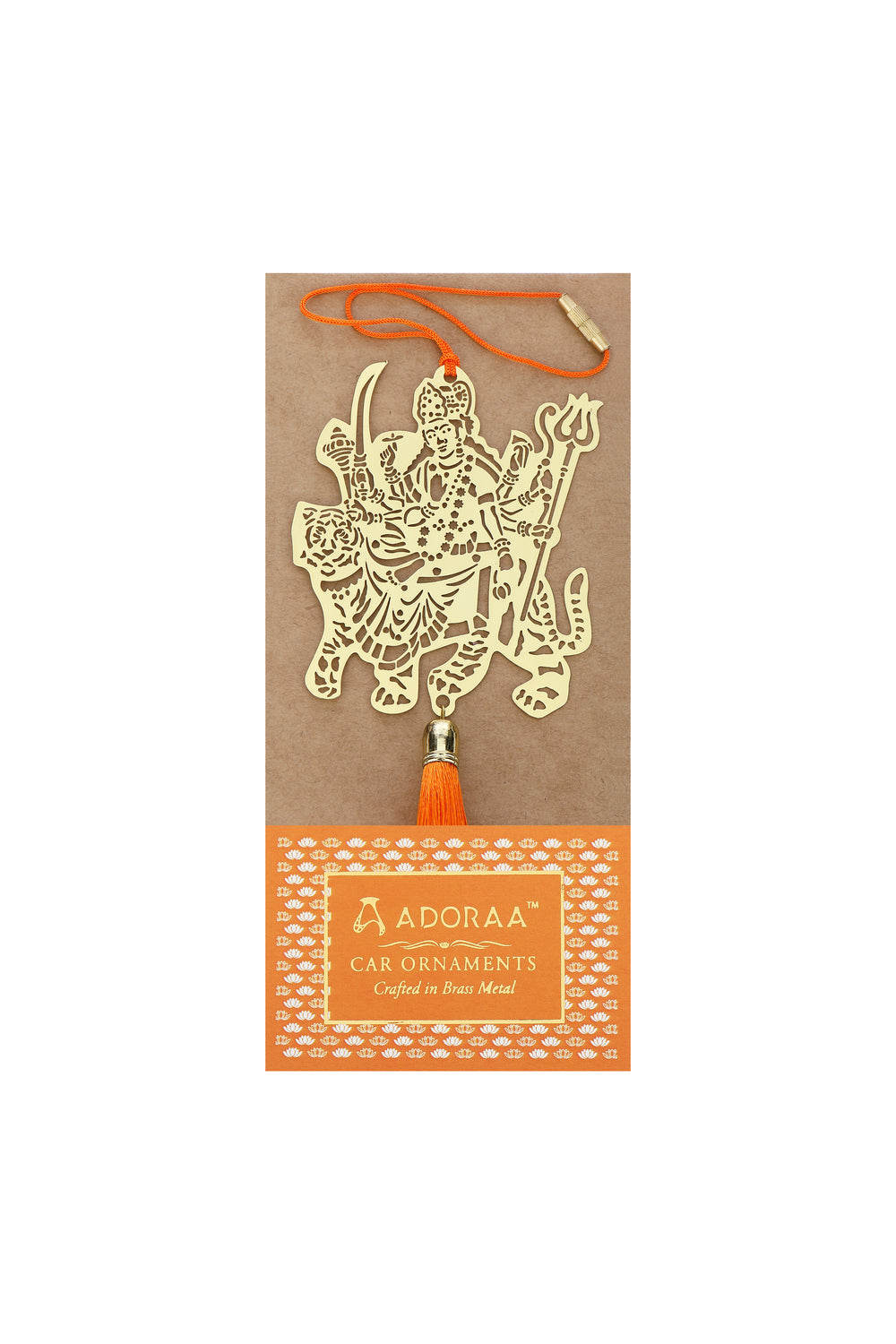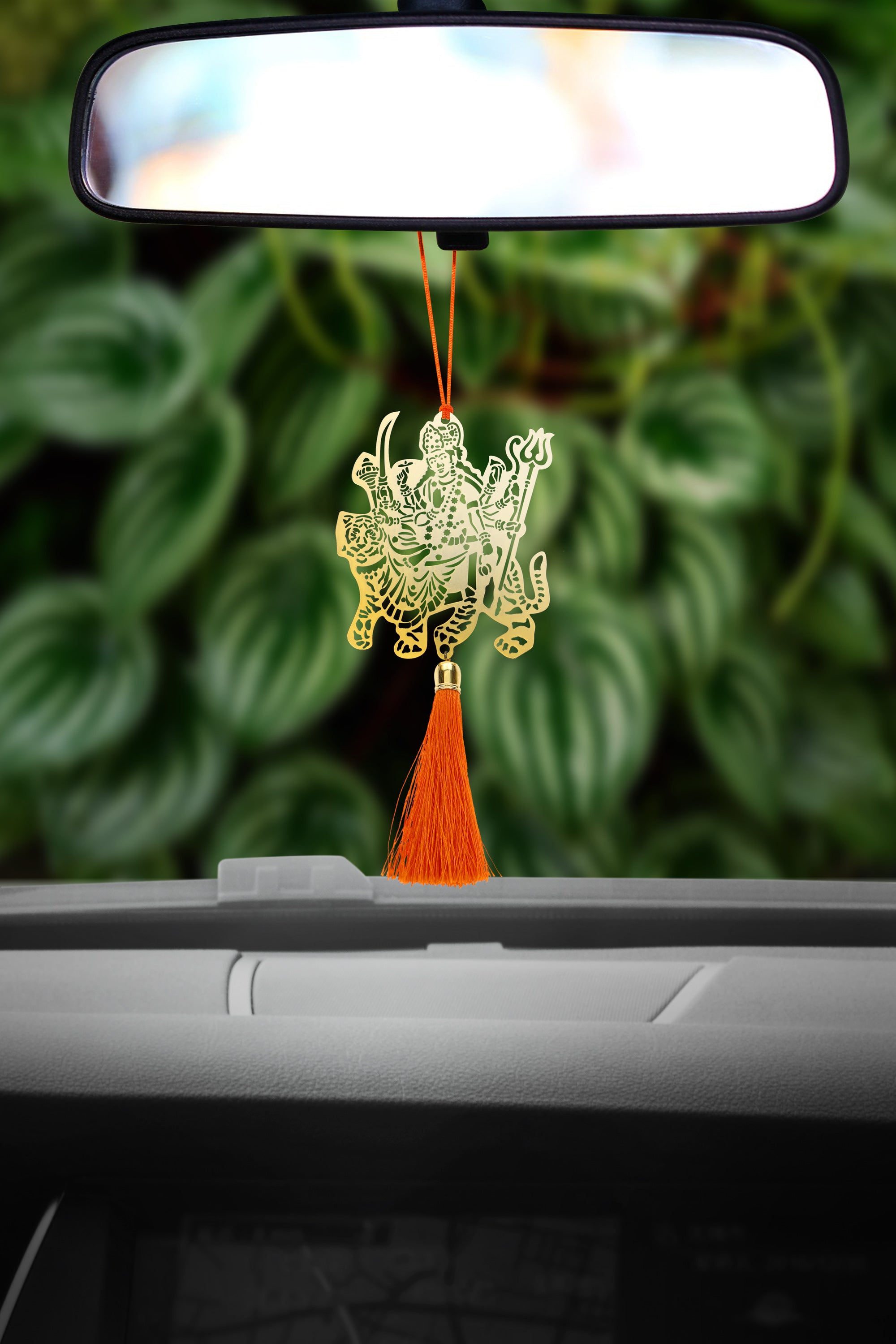 ADORAA's Hindu Goddess Durgaa Maa/ Devi Maa/ Maata Rani/ Sherawaali Hanging Accessories for Car rear view mirror Decor in Brass with red tassel and dori. Handcrafted, by women artisans. Exclusive collection of Elegant design Automotive Rear View Mirror charm for your special car. Great decoration for car and perfect Gift for your friend, family and lover