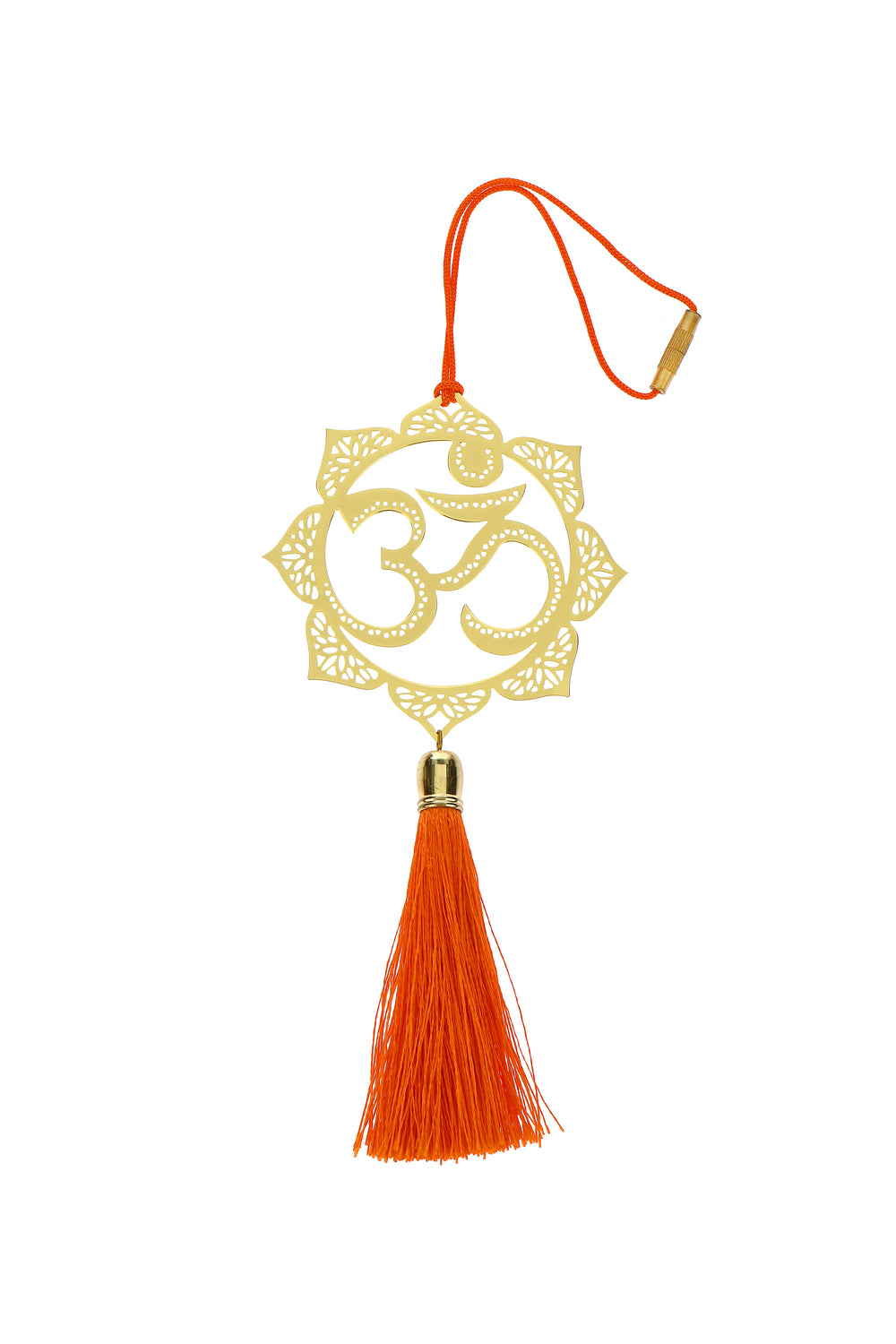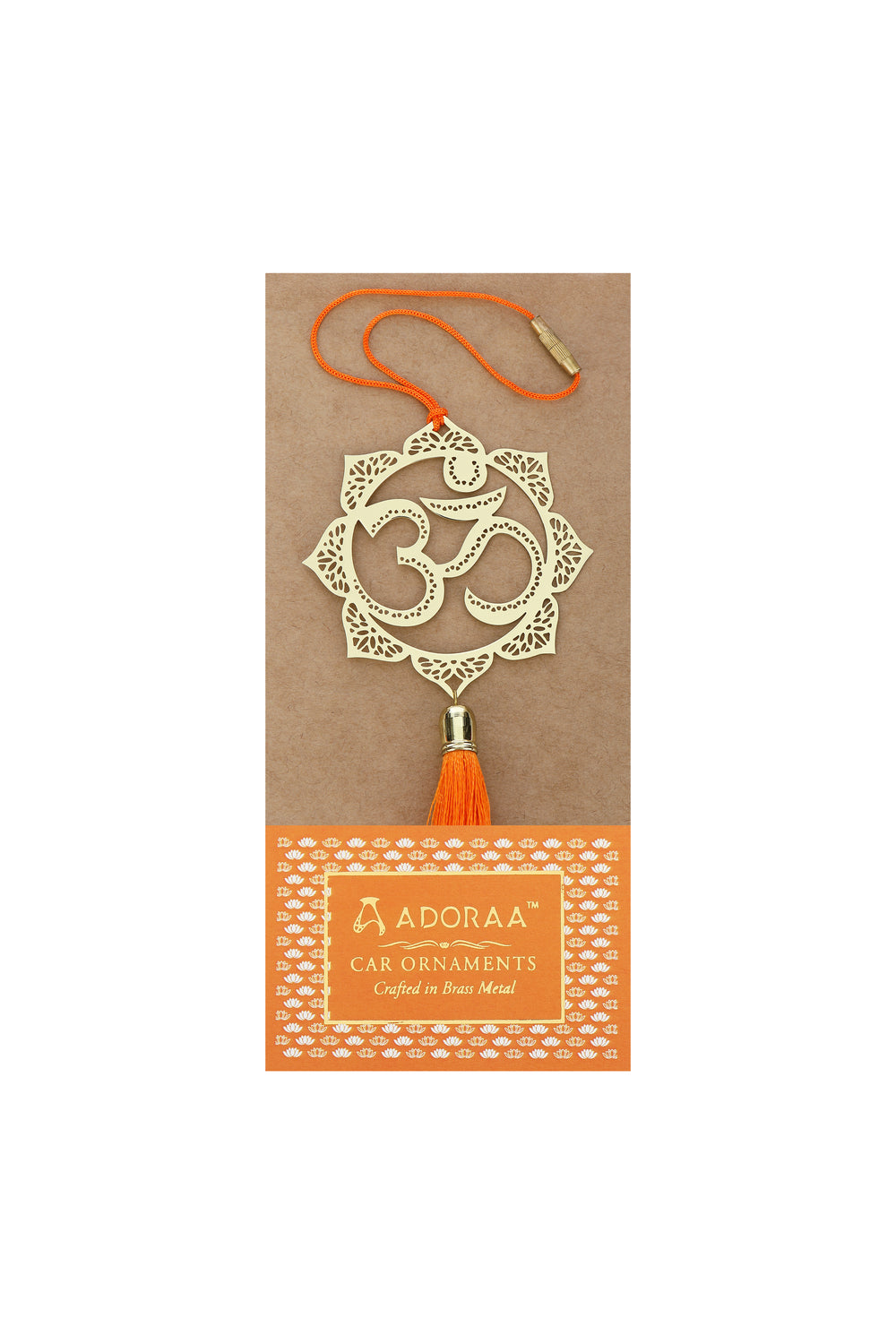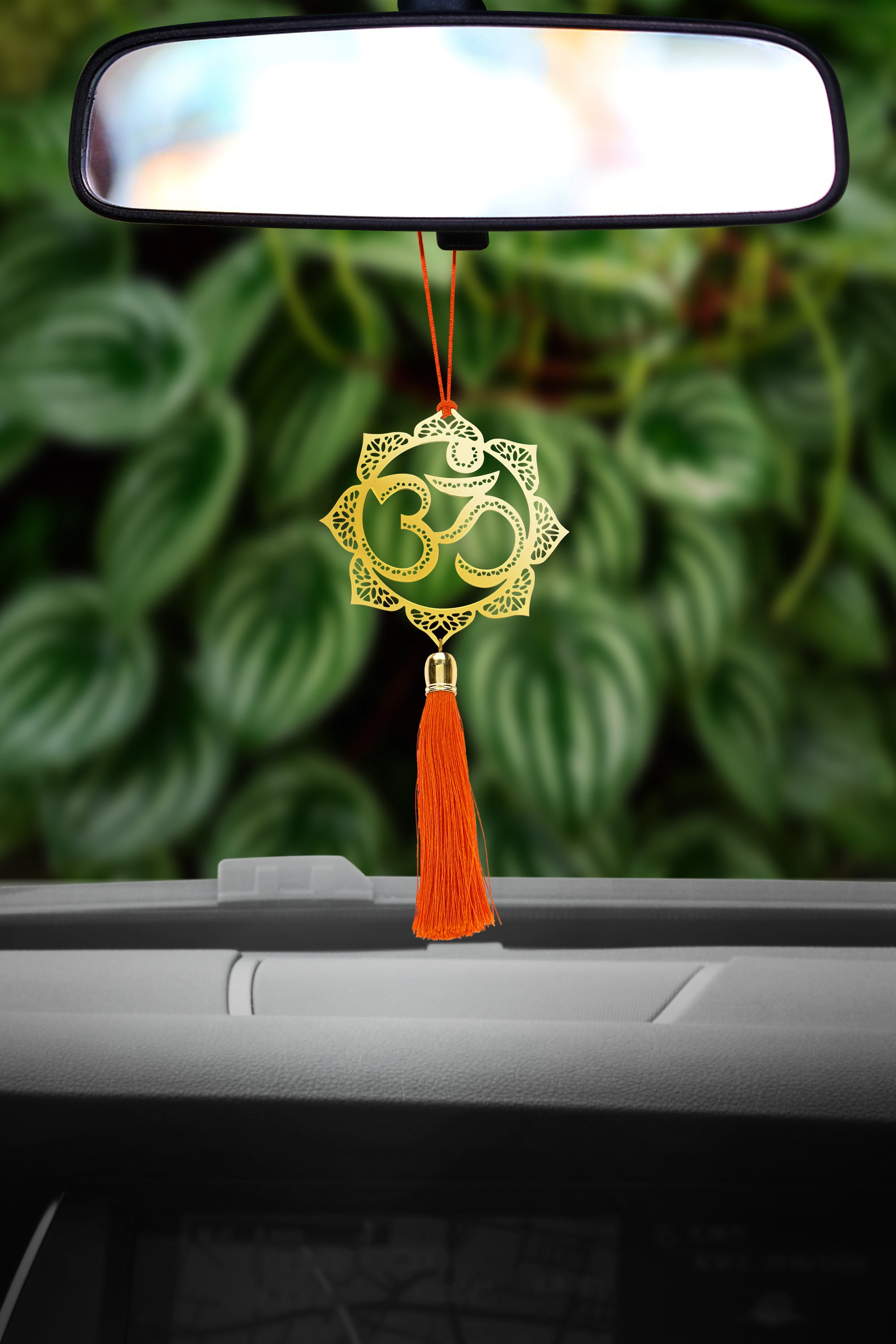 Floral Design Hindu OM Symbol Golden Brass Metal Car Hanging rear view mirror Accessory/Décor with Red Dori & Tassel. Handcrafted, by women artisans. Exclusive collection of Elegant design Automotive Rear View Mirror charm for your special car. Great decoration for car and perfect Gift for your friend, family and lover