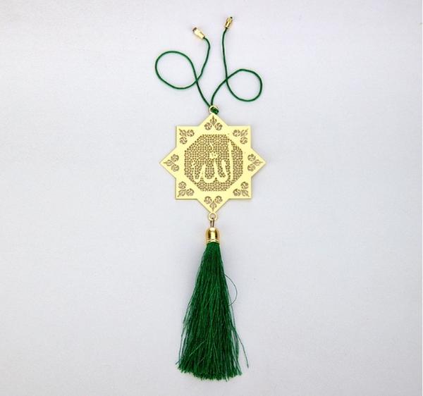 Islamic Allah Engraved Golden Brass Metal Car Hanging rear view mirror Accessory/Décor with Green Dori & Tassel. Handcrafted, by women artisans. Exclusive collection of Elegant design Automotive Rear View Mirror charm for your special car. Great decoration for car and perfect Gift for your friend, family and lover