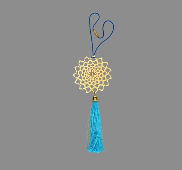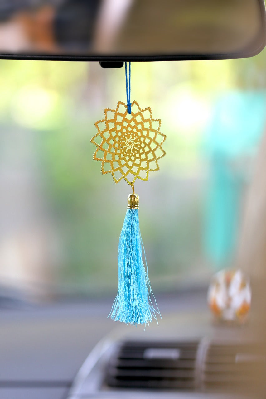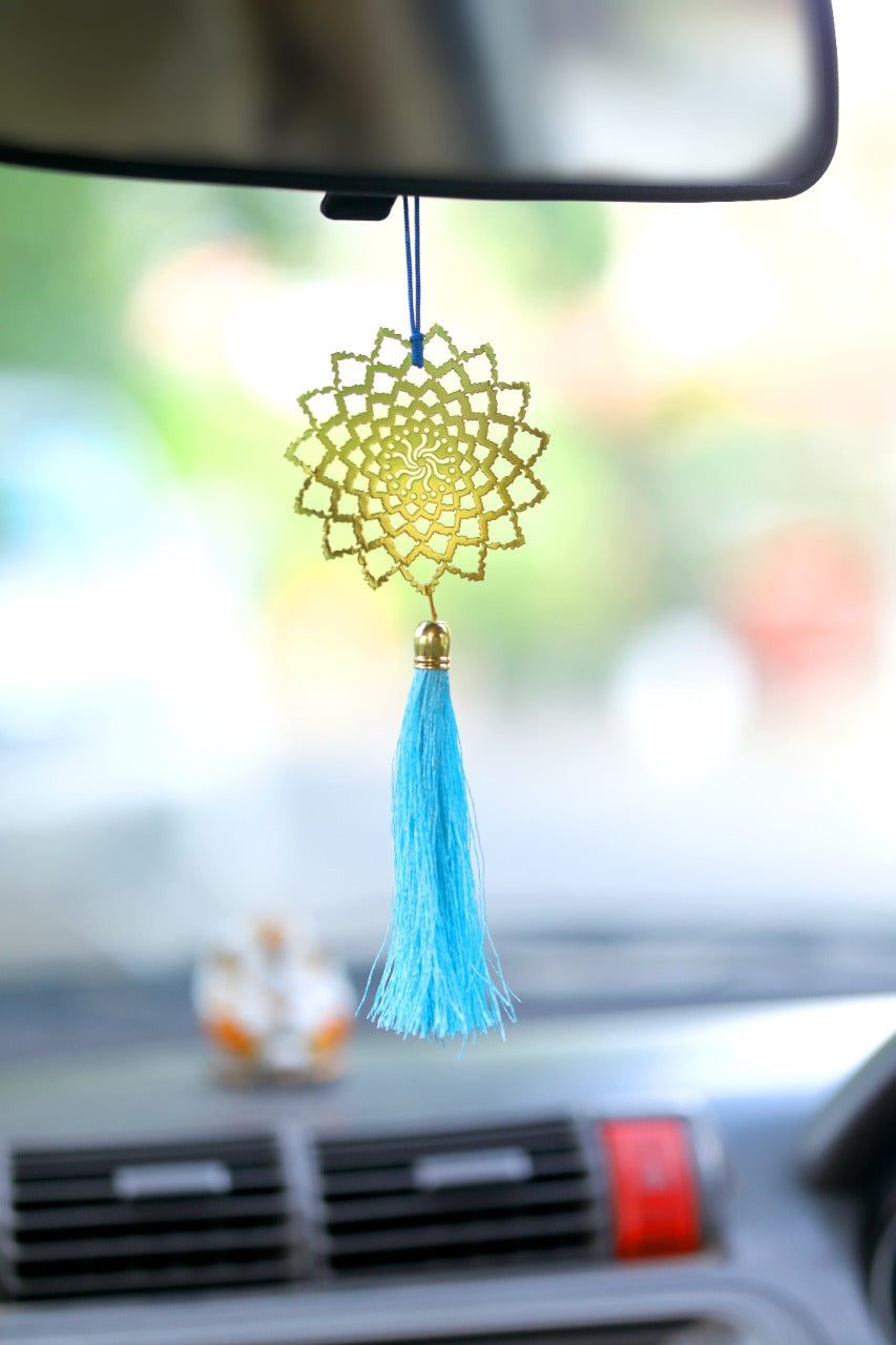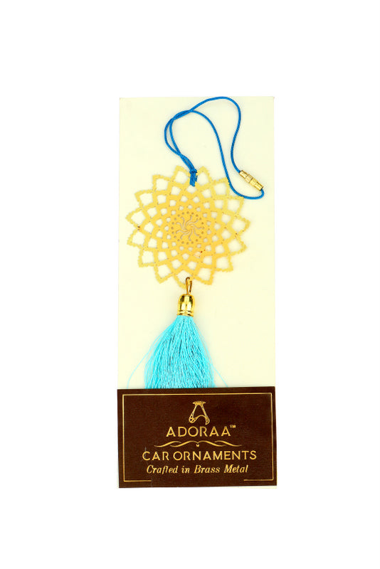 ADORAA's Noor Collection circular jaali Hanging Accessories for Car rear view mirror Decor in Brass with turquoise blue tassel and blue dori. Handcrafted, by women artisans. Exclusive collection of Elegant design Automotive Rear View Mirror charm for your special car. Great decoration for car and perfect Gift for your friend, family and lover
