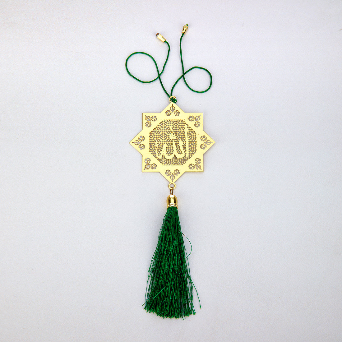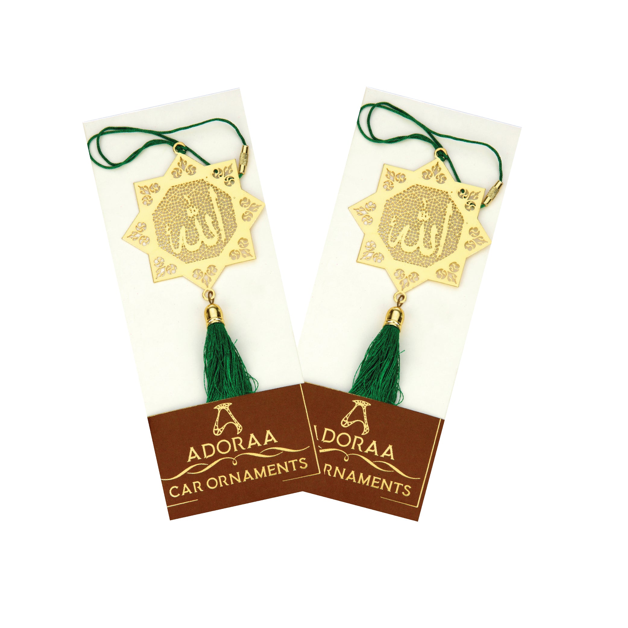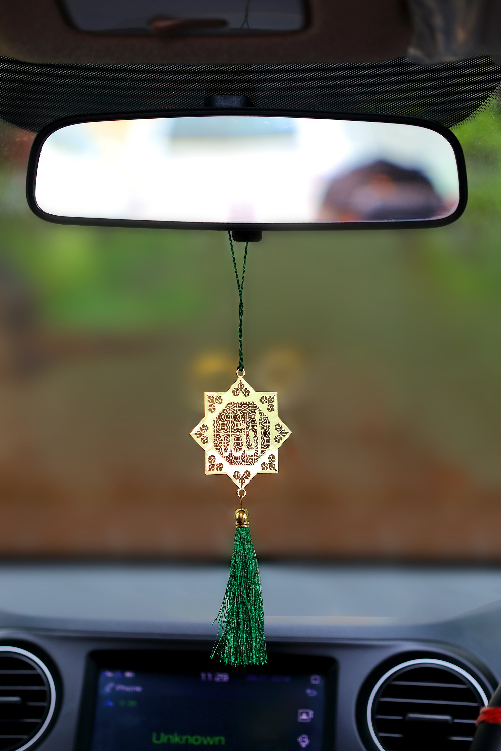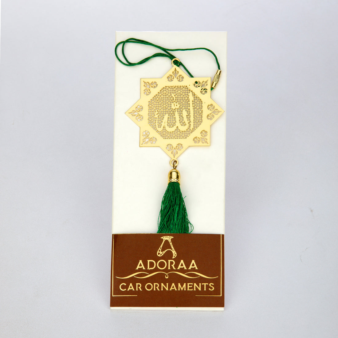 Islamic Allah Engraved Golden Brass Metal Car Hanging rear view mirror Accessory/Décor with Green Dori & Tassel . Handcrafted, by women artisans. Exclusive collection of Elegant design Automotive Rear View Mirror charm for your special car. Great decoration for car and perfect Gift for your friend, family and lover.