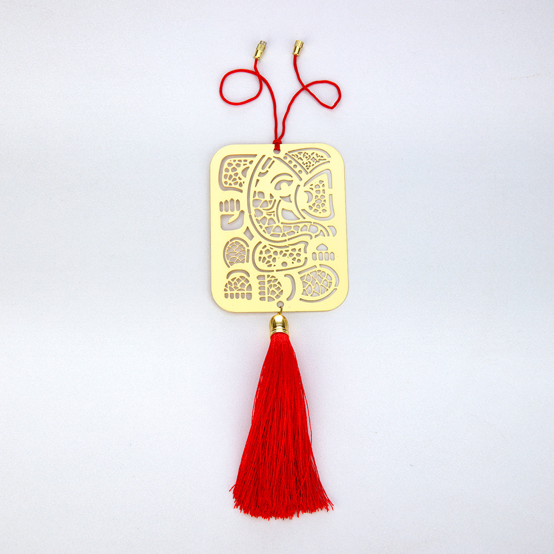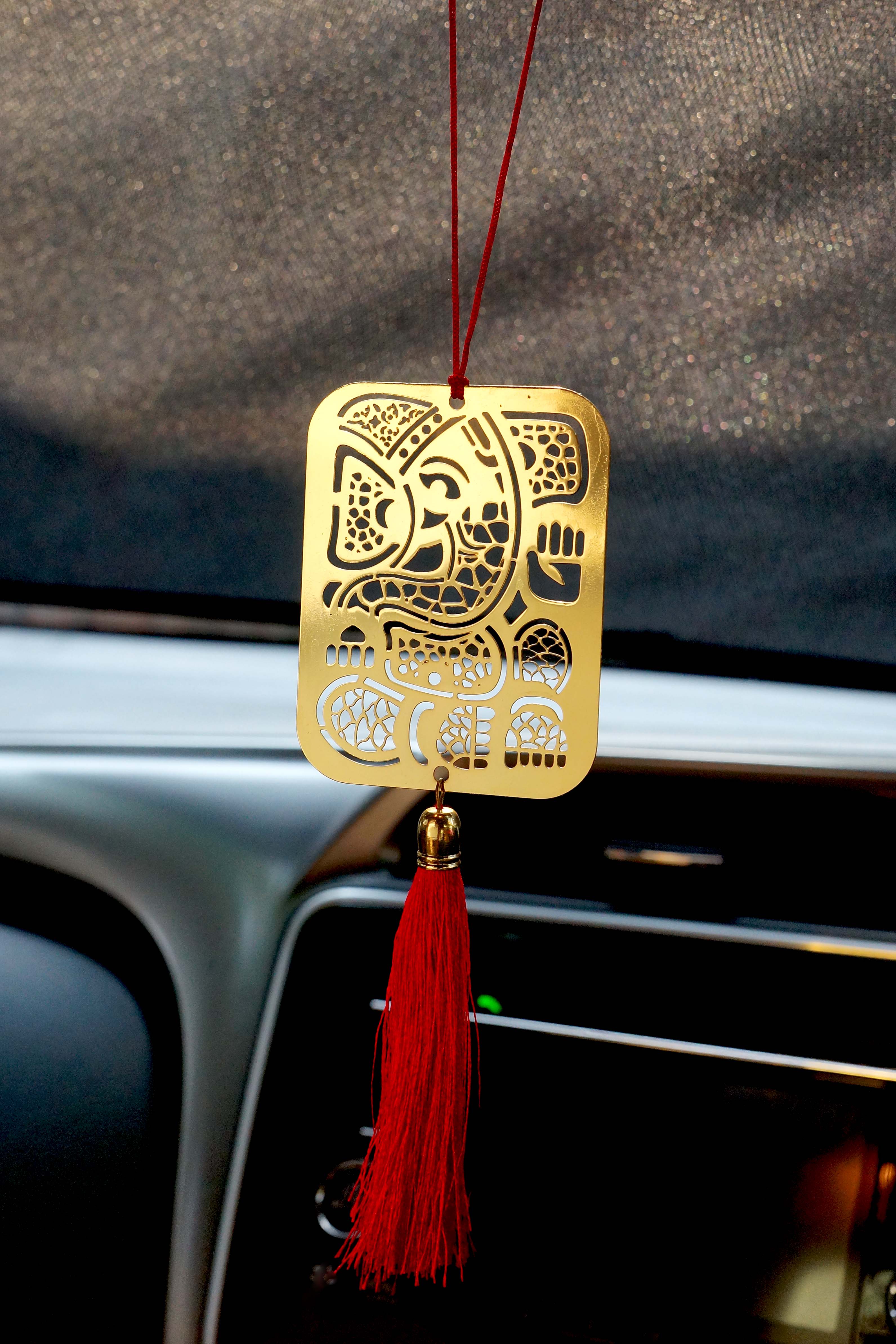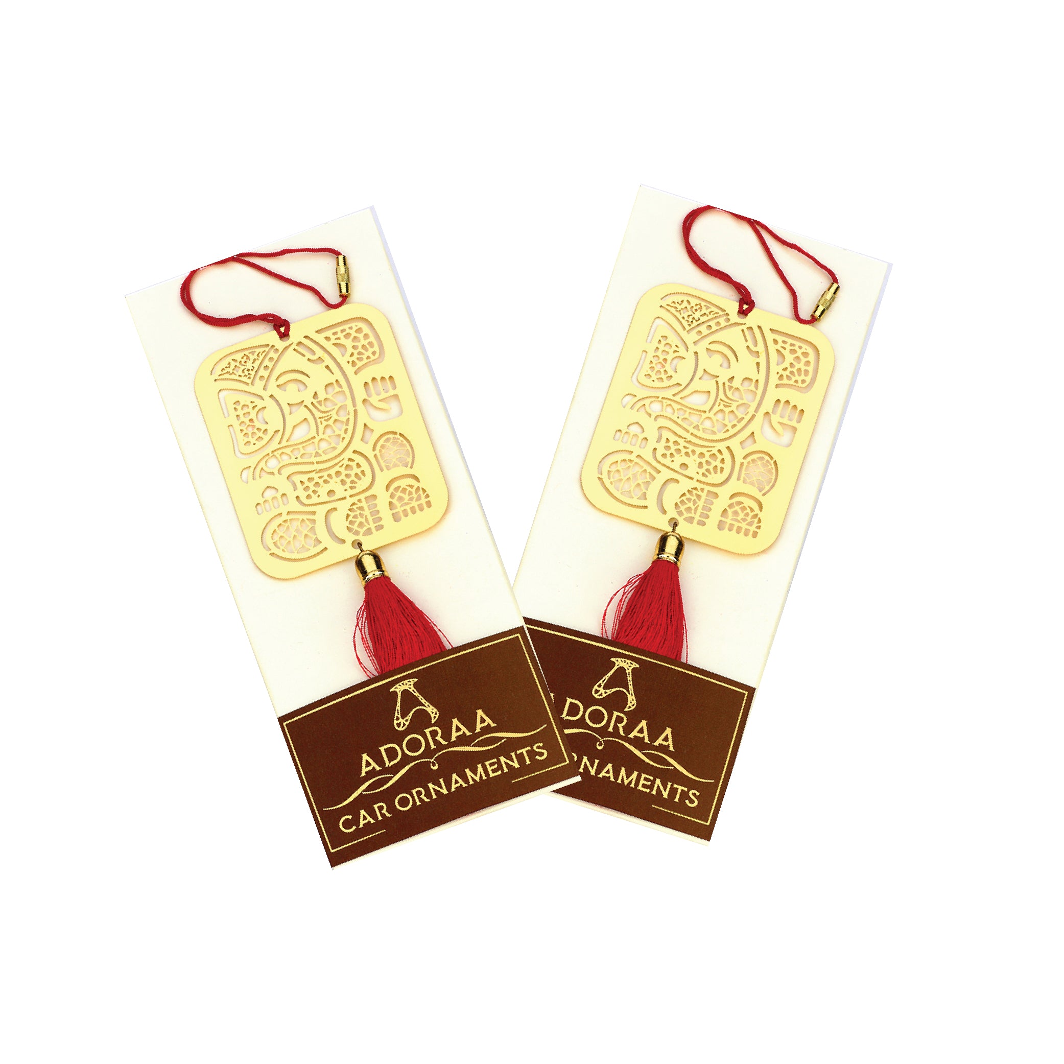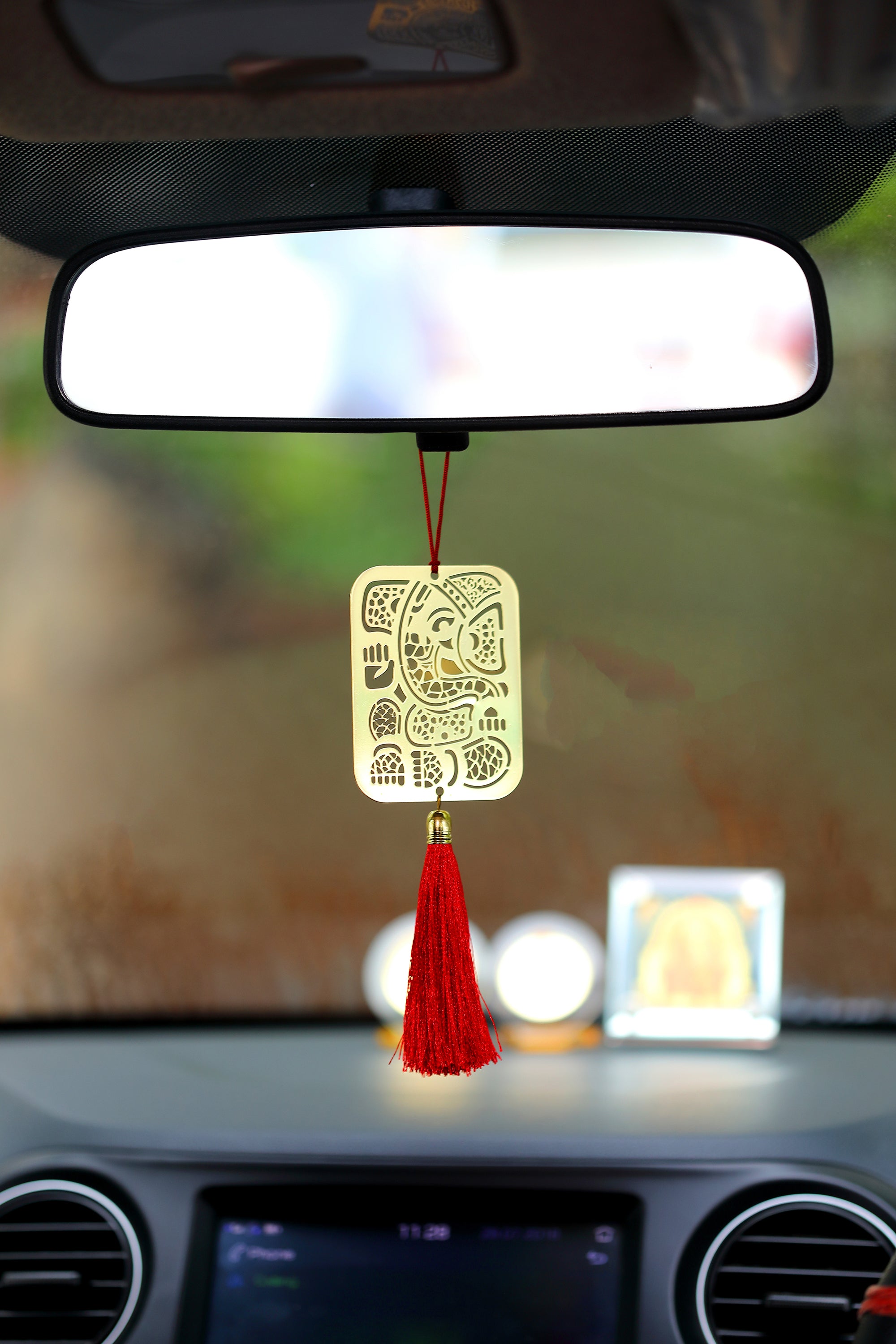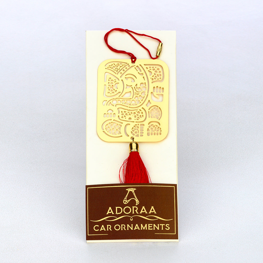 ADORAA's Geometrical Ganesha Ganesh Ganpati Hanging Accessories for Car rear view mirror Decor in Brass with Red Dori & Tassel . Handcrafted, by women artisans. Exclusive collection of Elegant design Automotive Rear View Mirror charm for your special car. Great decoration for car and perfect Gift for your friend, family and lover.