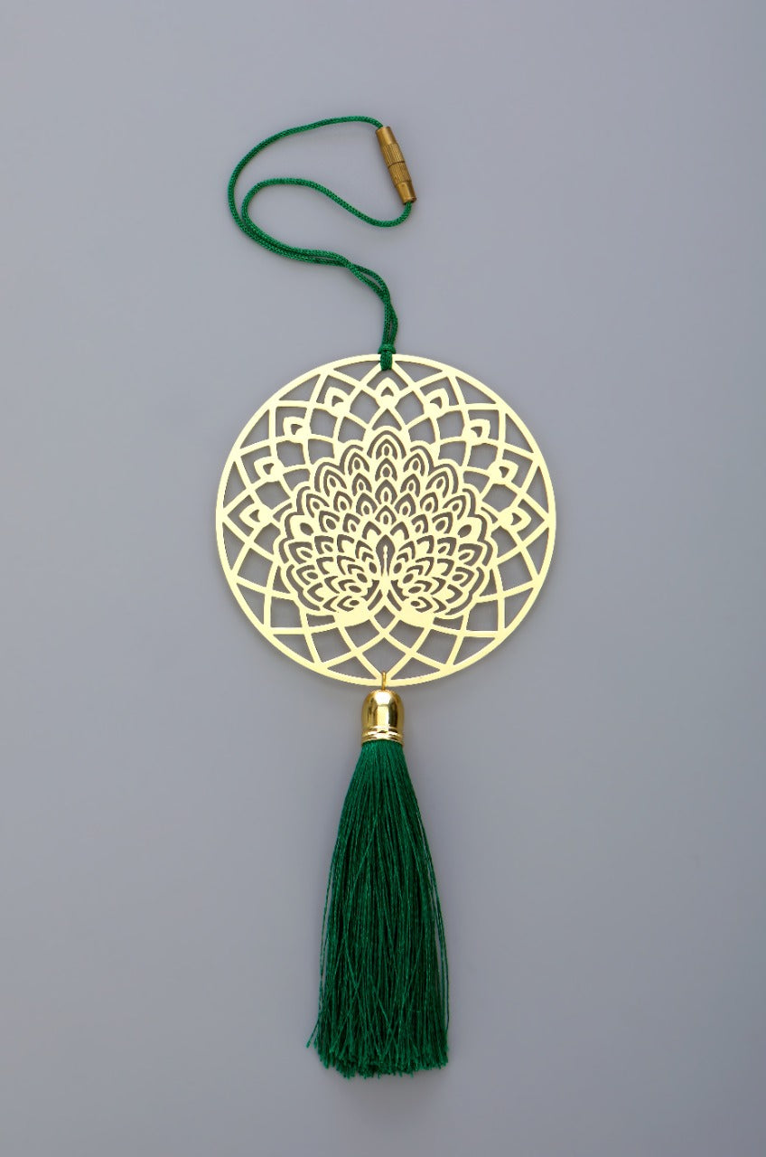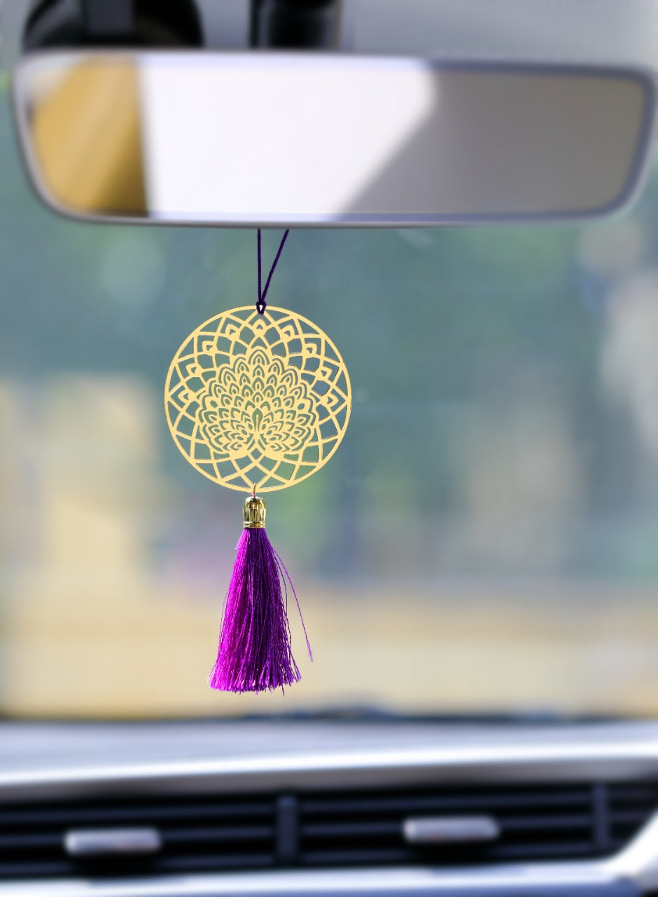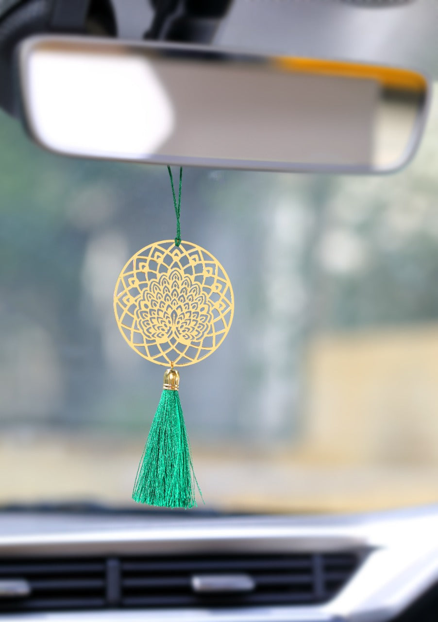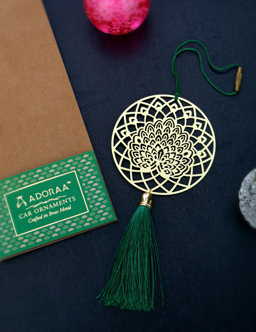 Adoraa's brass Metal Car Hanging rear view mirror Accessory/Décor in brass with satin dori & tassel . Handcrafted, by women artisans. Exclusive collection of Elegant design Automotive Rear View Mirror charm for your special car. Great decoration for car and perfect Gift for your friend, family and lover.