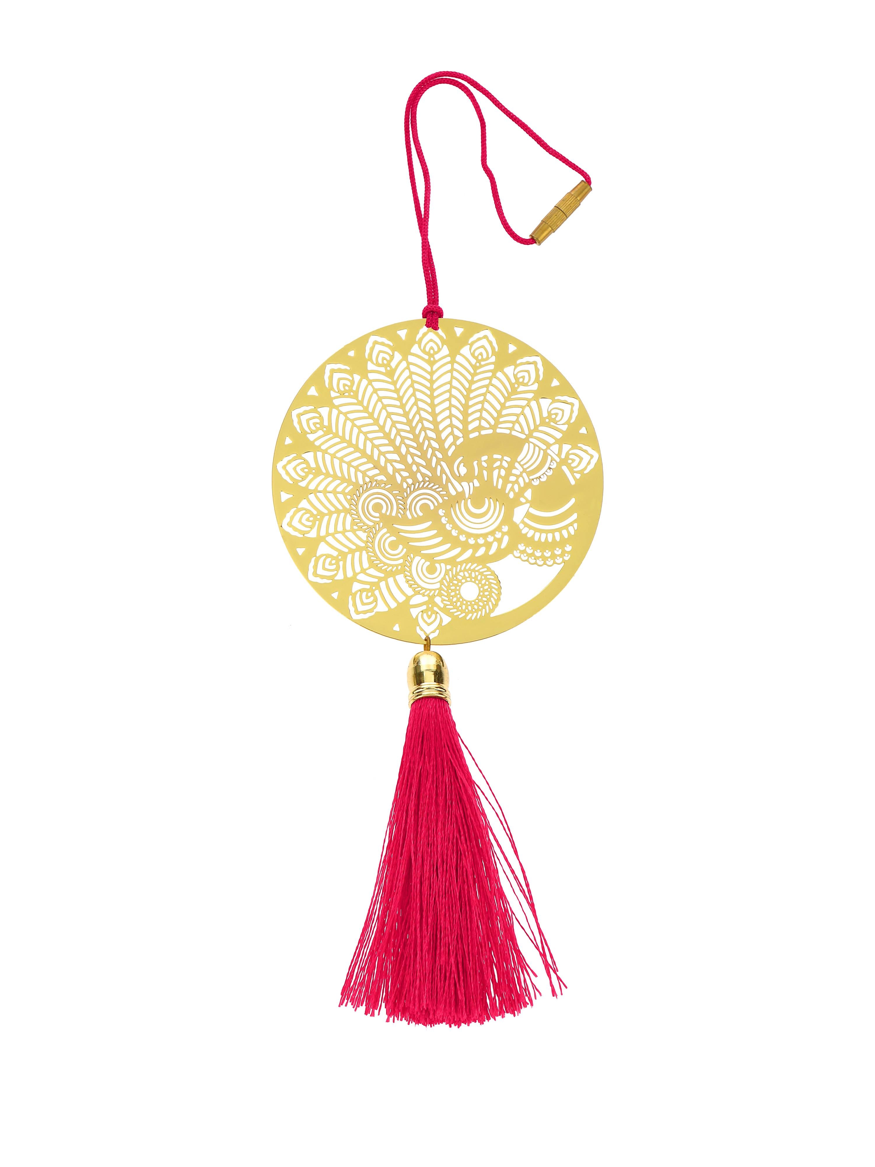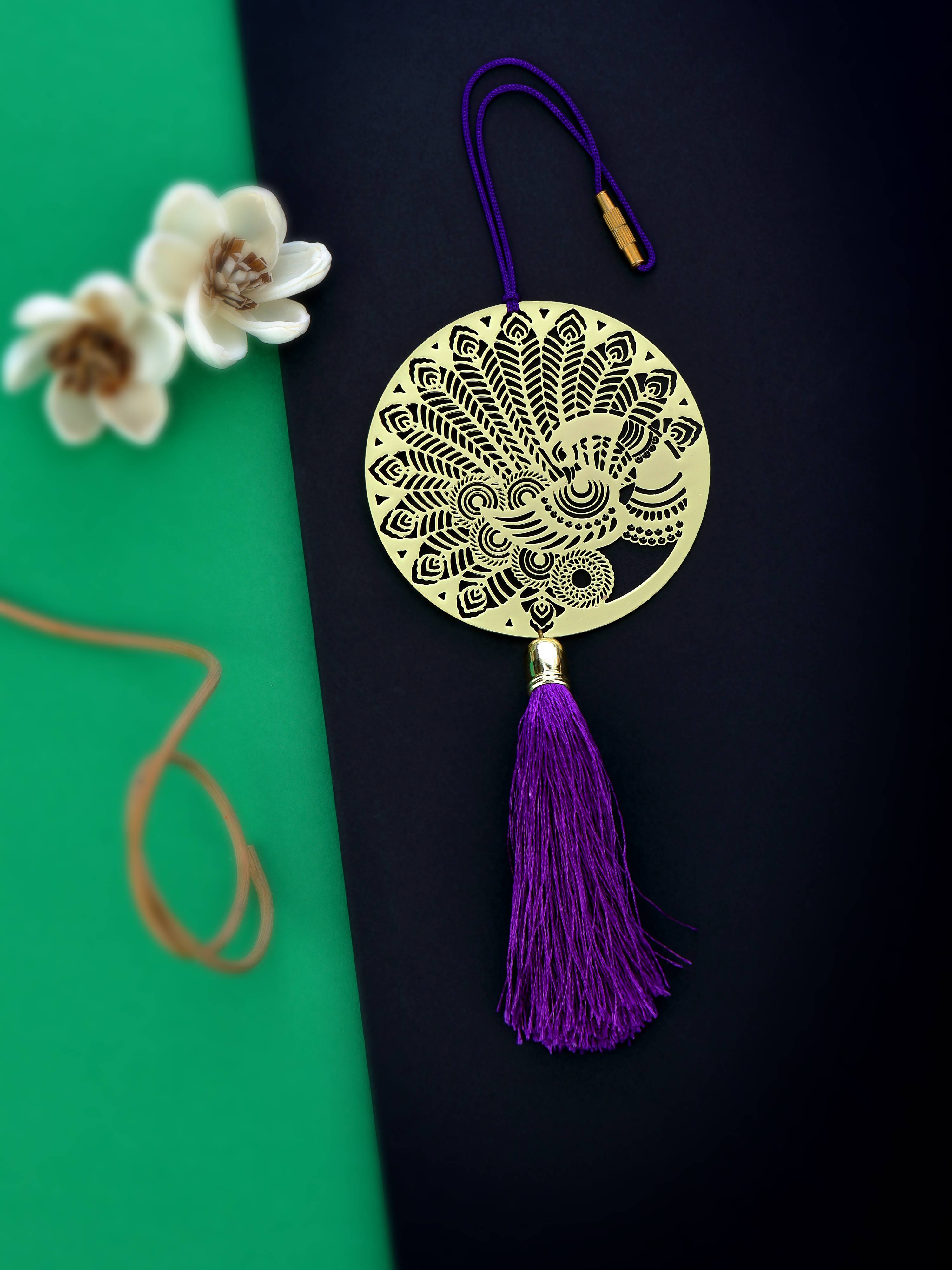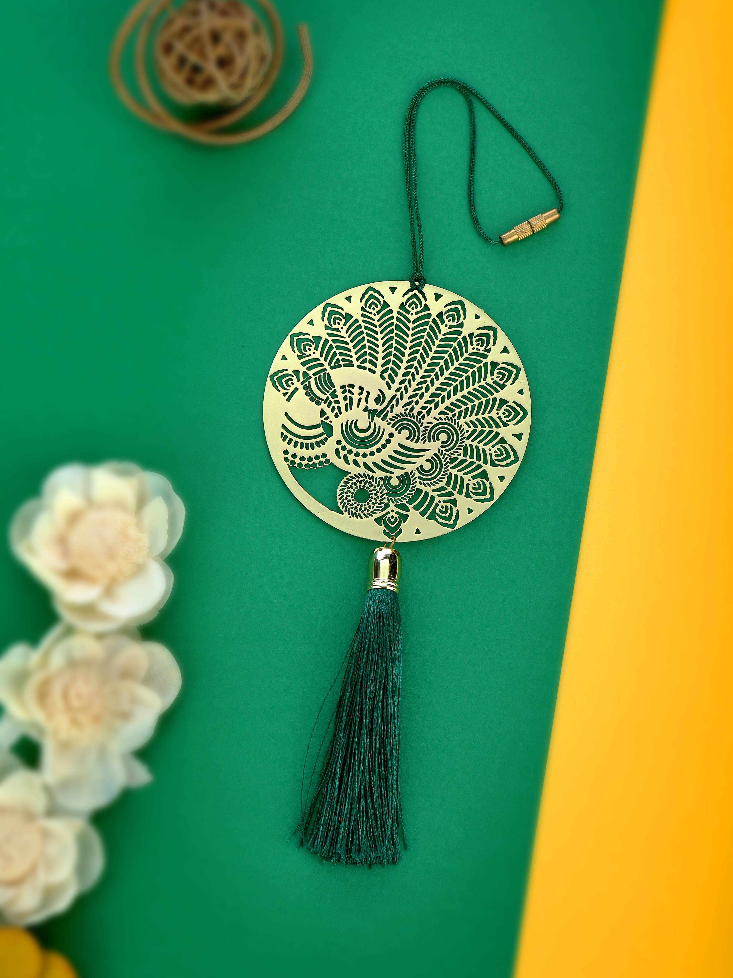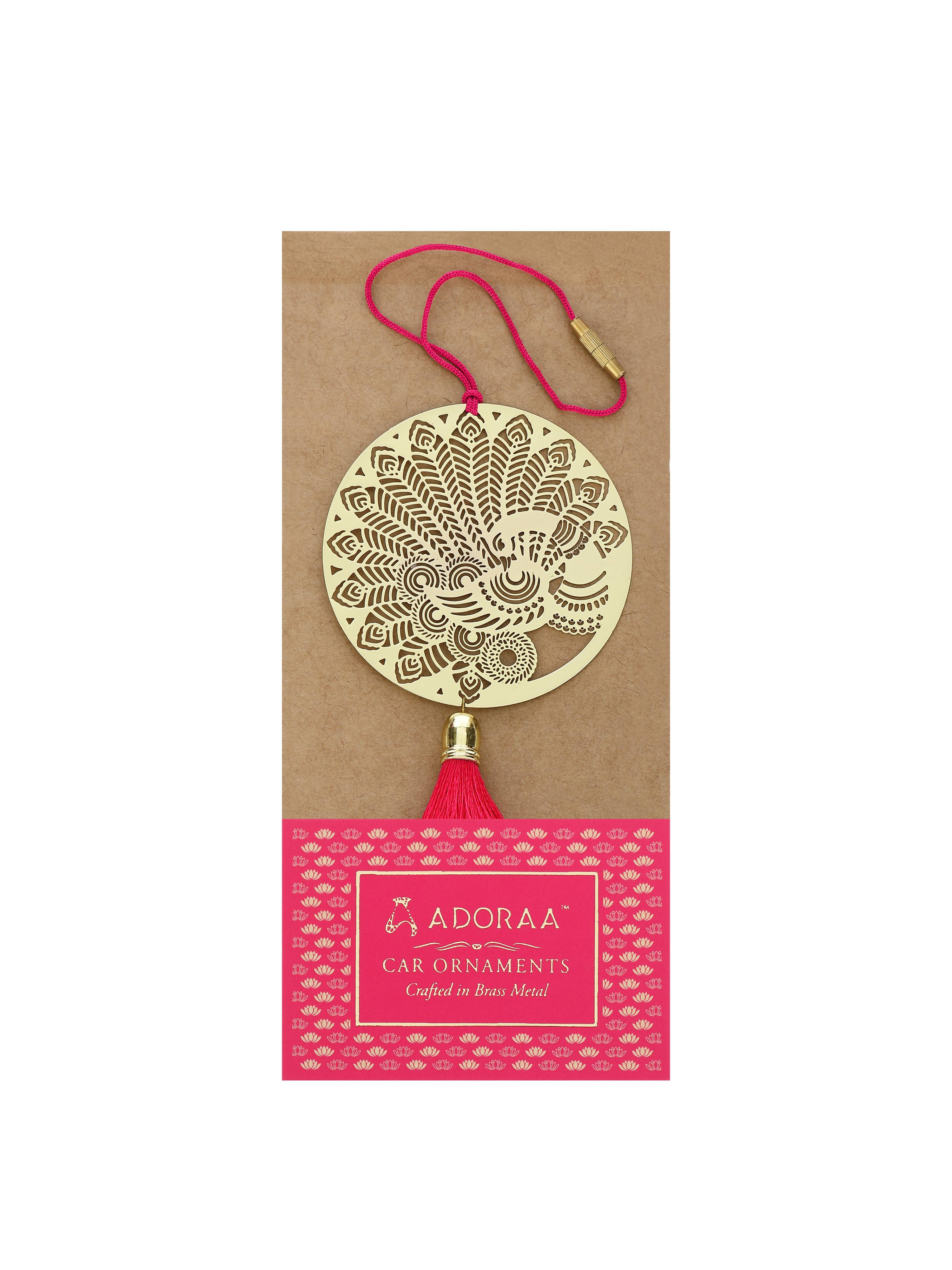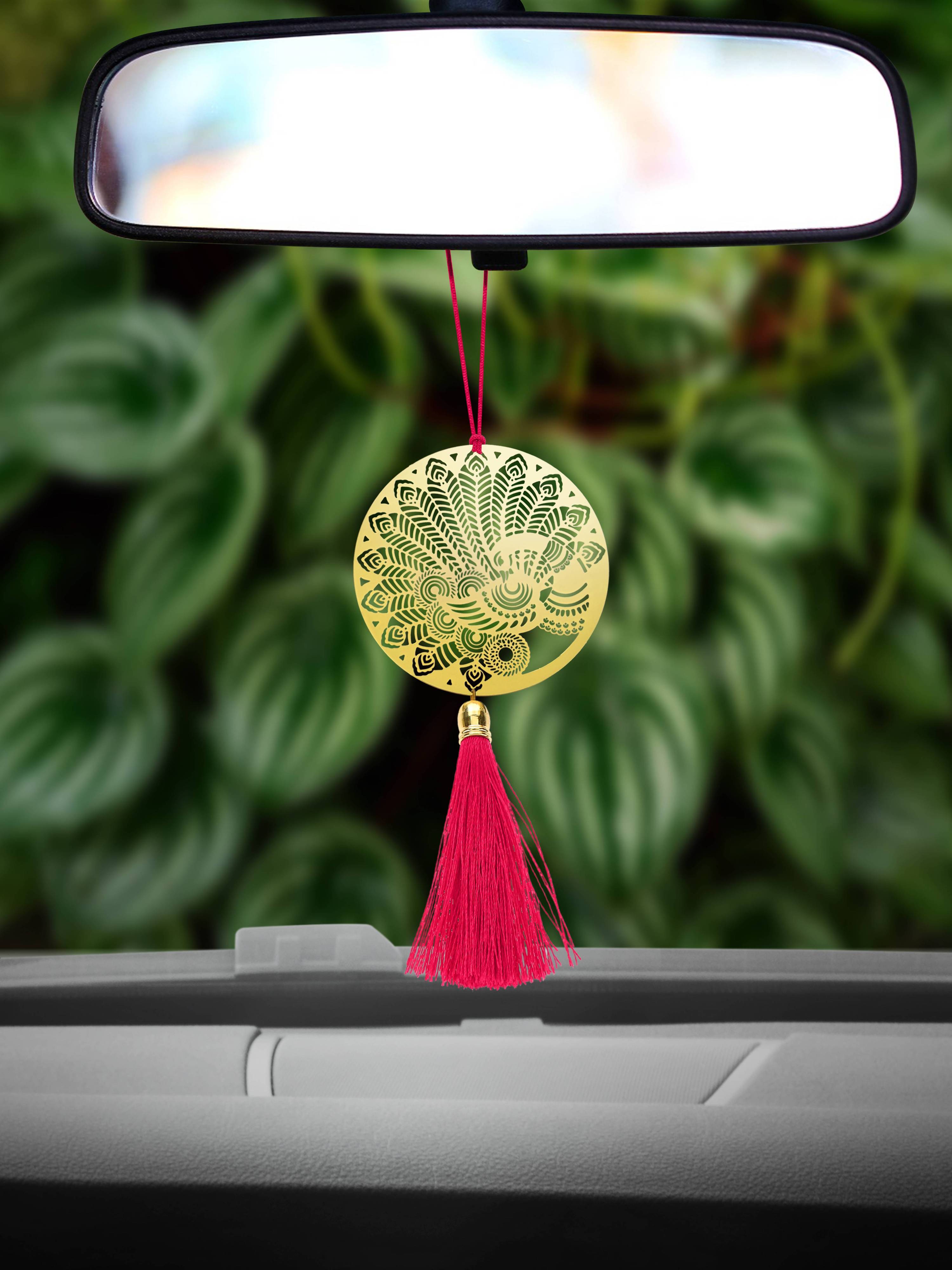 Adoraa's Kalamkaari Peacock Feather Car Hanging Metal Car Hanging rear view mirror Accessory/Décor in brass with satin dori & tassel. Handcrafted, by women artisans. Exclusive collection of Elegant design Automotive Rear View Mirror charm for your special car. Great decoration for car and the perfect gift for your friend, family, and lover. This car hanging is inspired by Kalamkari Indian Art. This car hanging is inspired by Kalamkari Indian Art. It depicts a beautiful peacock feather. It is handcrafted by applying engraving & cutting techniques on brass metal, a skill deeply rooted in Indian metalworking.